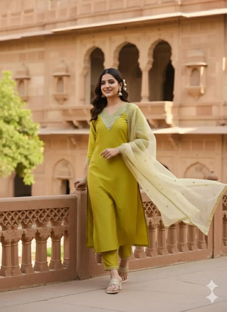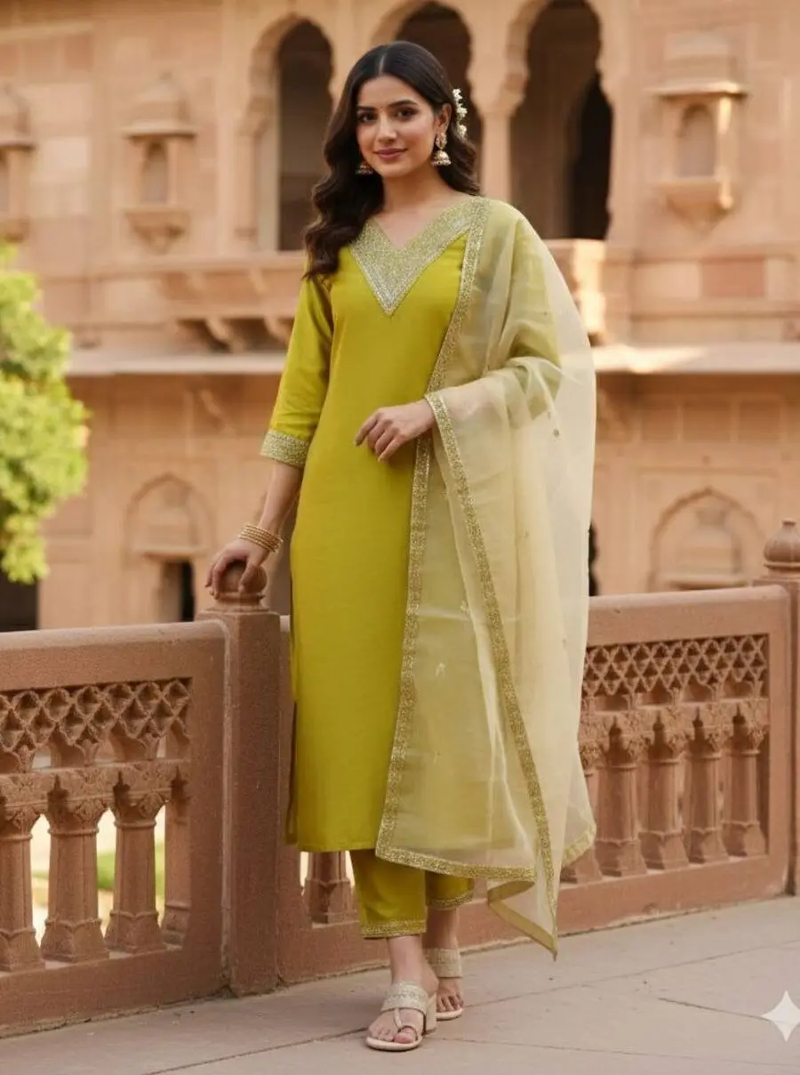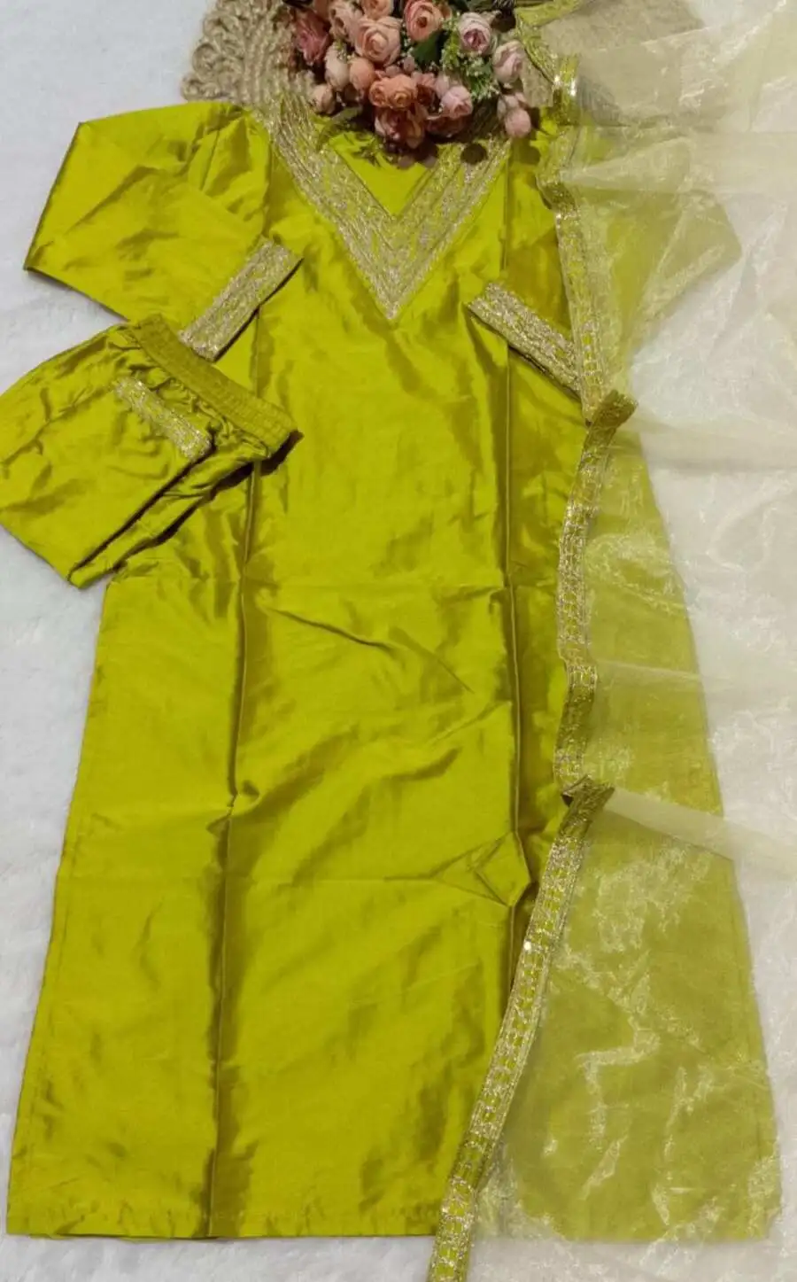 FANCY TAPETA SILK EMBROIDERY WORK TOP BOTTOM WITH DUPATTA PARROT GREEN