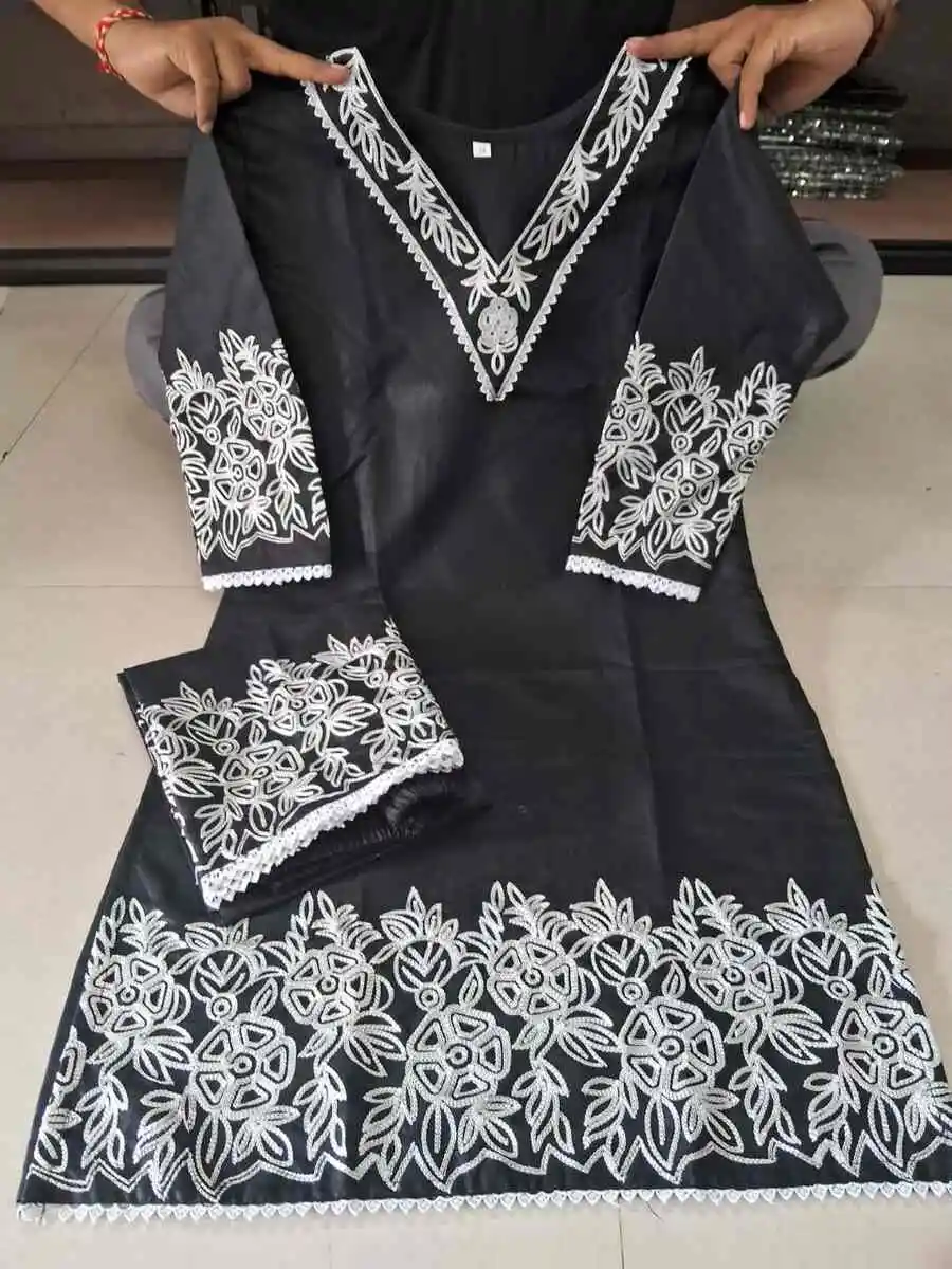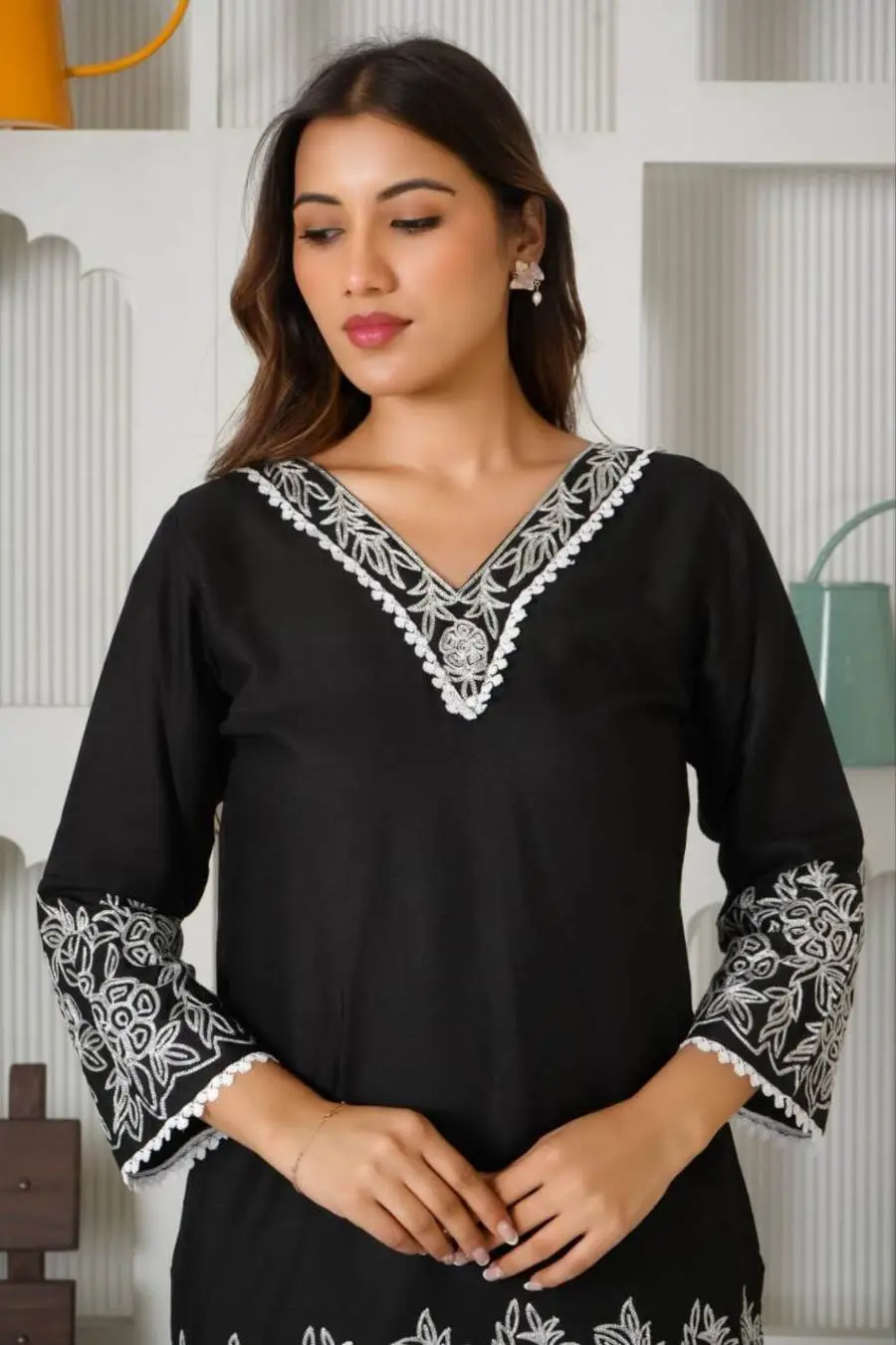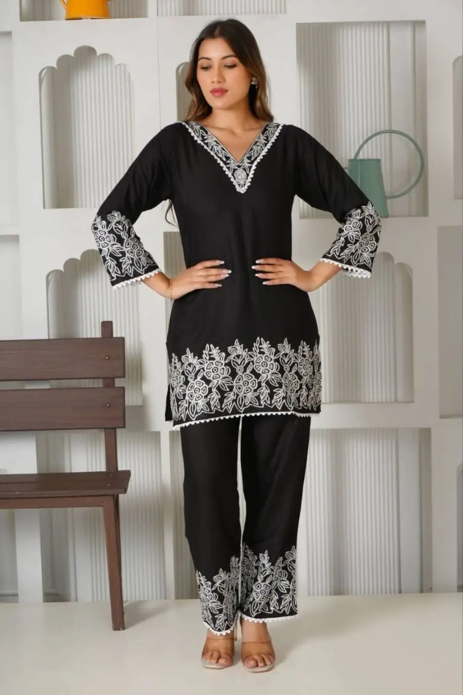 FANCY TESLA COTTON SLUB EMBROIDERY WORK CO-ORD SET BLACK
