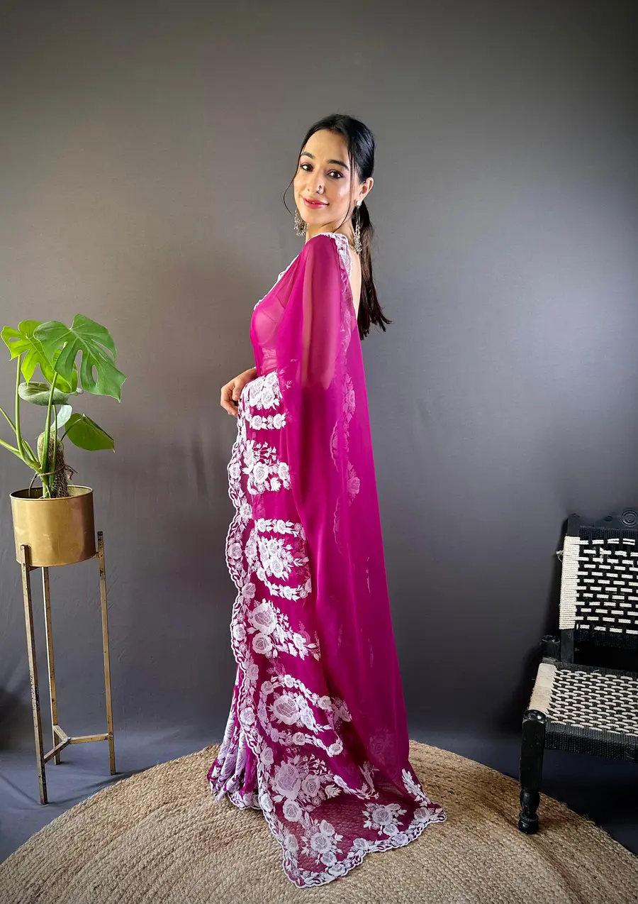 SAREES FABRIC :- SOFT GEORGETTE FABRIC WITH WHITE THREAD EMBROIDERED WORK WITH CUTWORK LACE BORDER