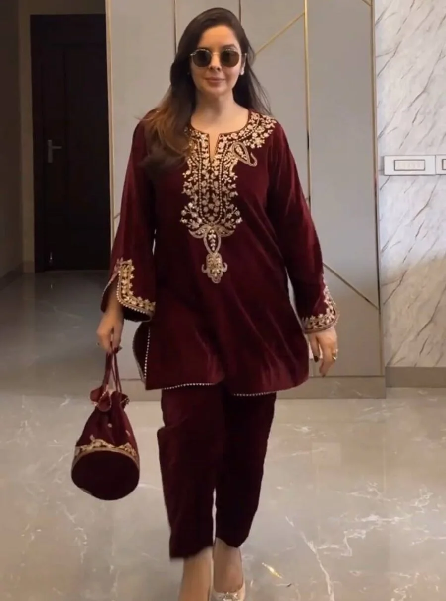 FANCY VELVET EMBROIDERY SEQUENCE WORK TOP BOTTOM SET WINE