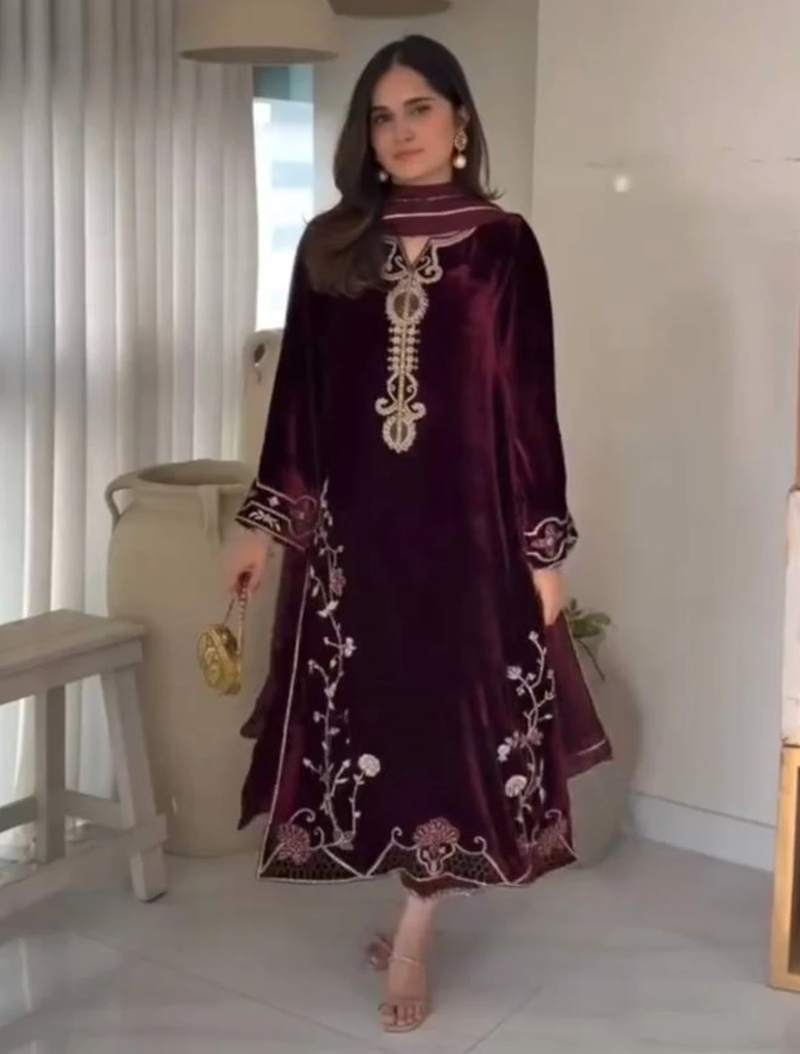FANCY VELVET EMBROIDERY SEQUENCE WORK TOP BOTTOM WITH DUPATTA MAROON
