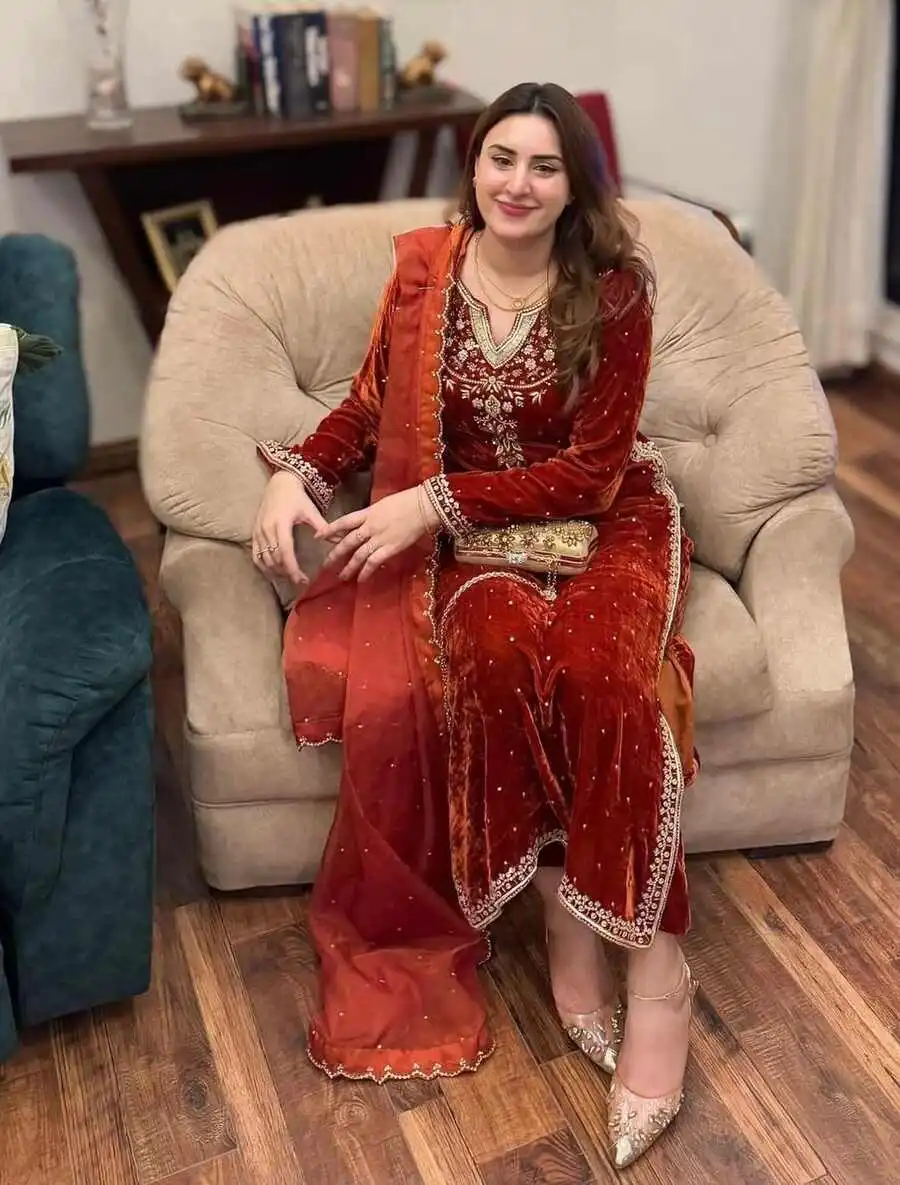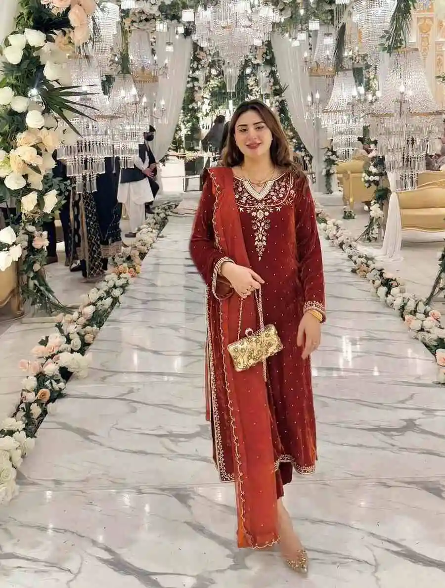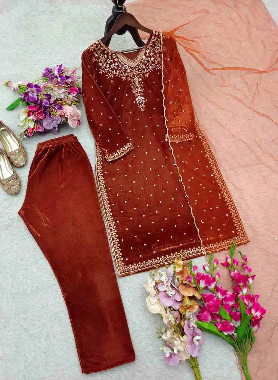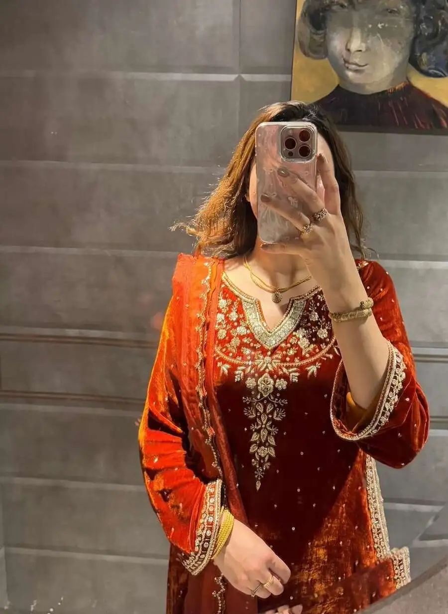 FANCY VELVET EMBROIDERY SEQUENCE WORK TOP BOTTOM WITH DUPATTA ORANGE