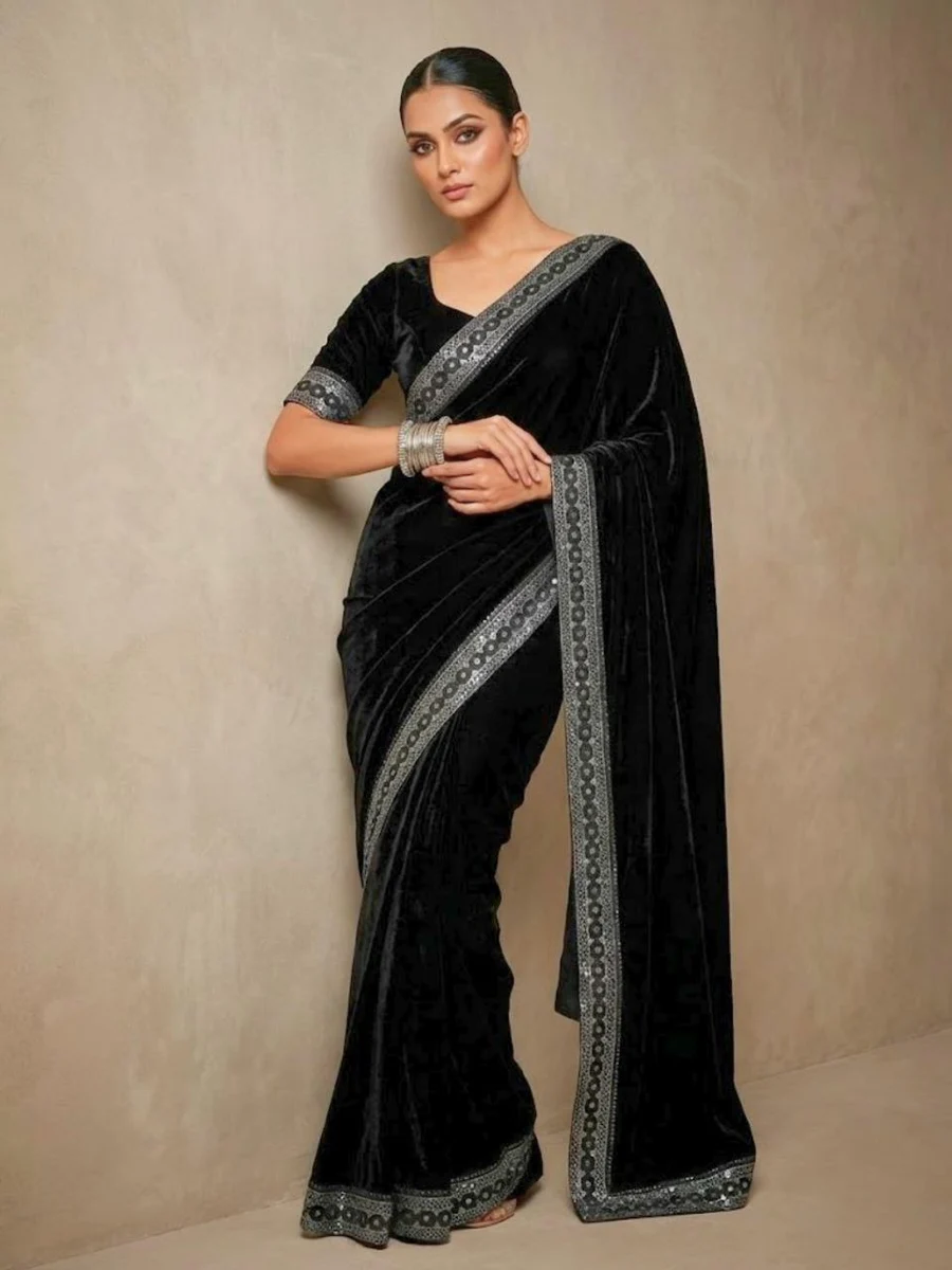 FANCY VELVET PLAIN WITH DUAL SEQUENCE ZARI THREAD EMBROIDERY WORK SAREE WITH UNSTITCHED BLOUSE BLACK