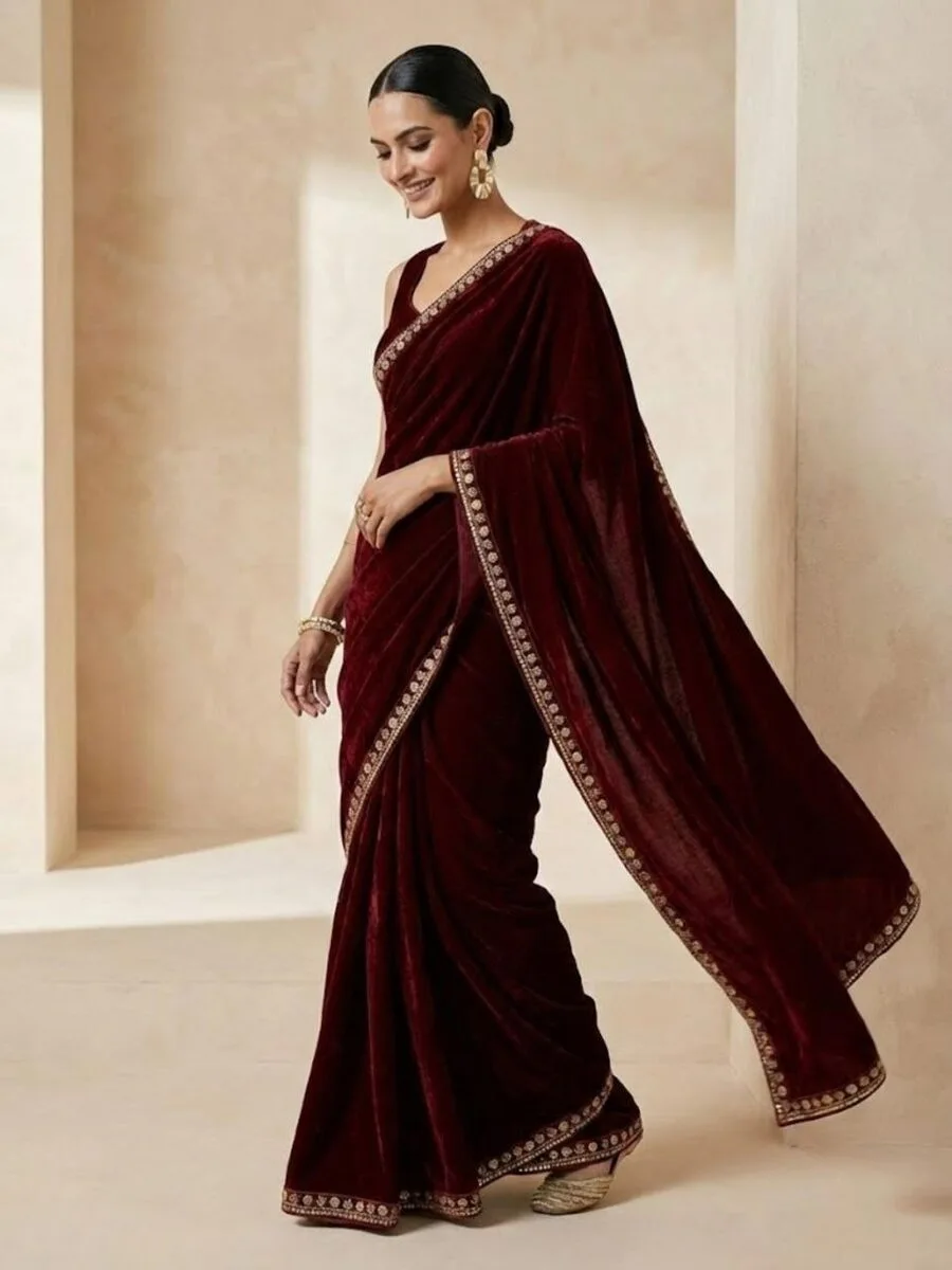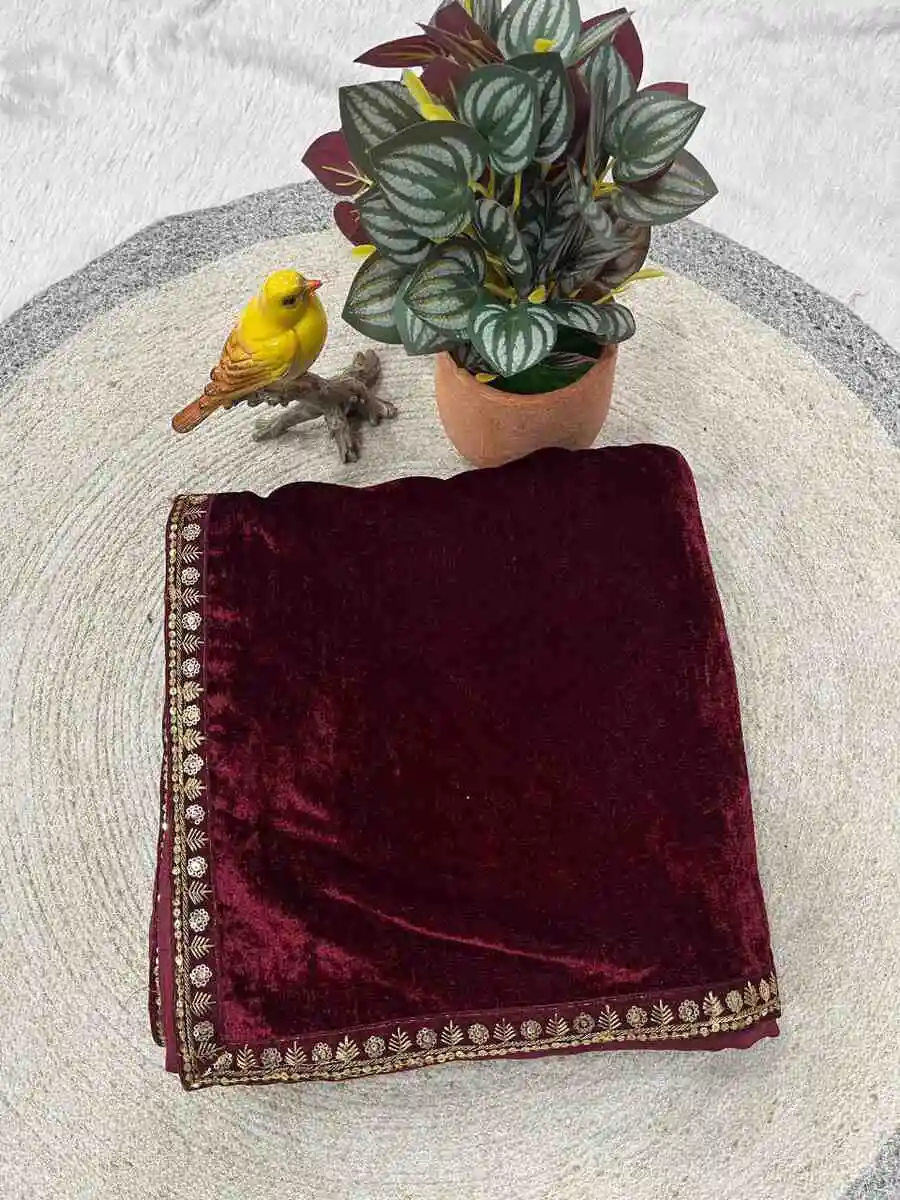 FANCY VELVET PLAIN WITH DUAL SEQUENCE ZARI THREAD EMBROIDERY WORK SAREE WITH UNSTITCHED BLOUSE MAROON
