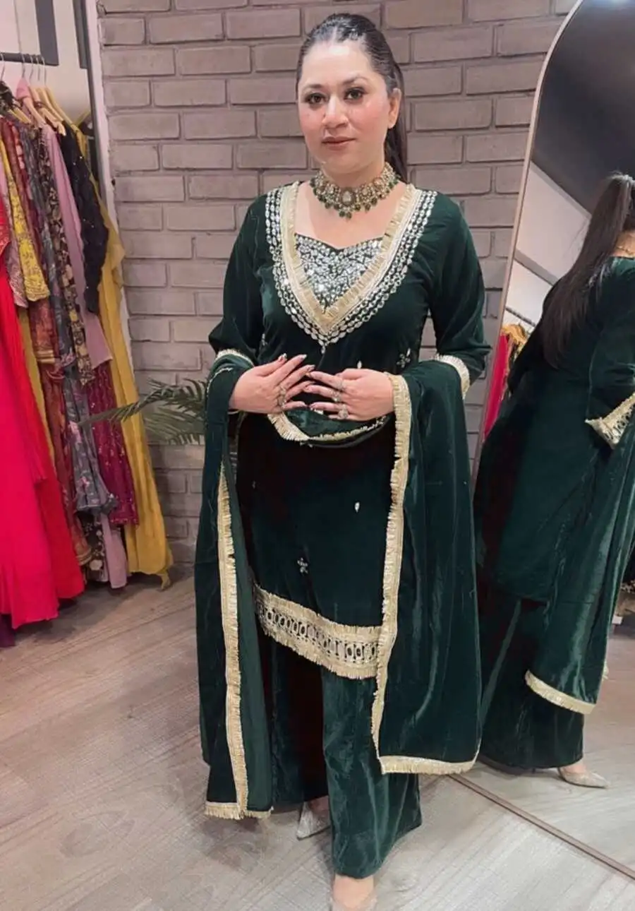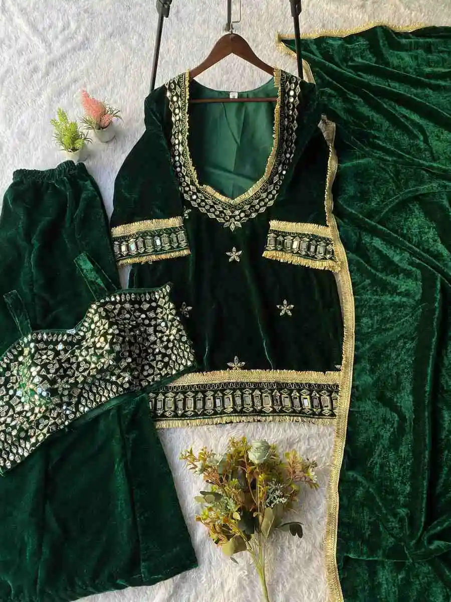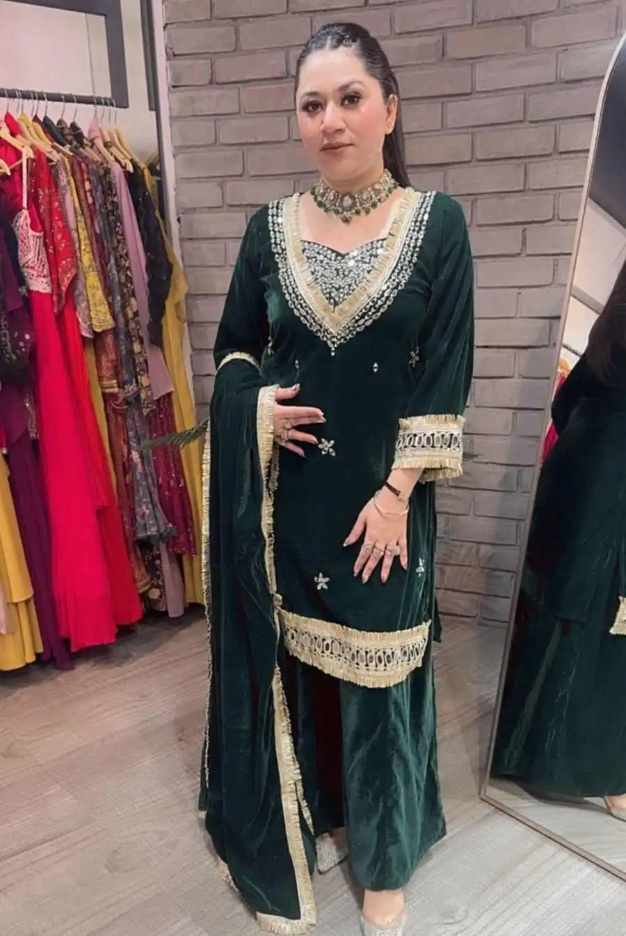 FANCY VELVET REAL MIRROR WORK WITH EMBROIDERY WORK TOP BLOUSE PALAZZO WITH DUPATTA GREEN