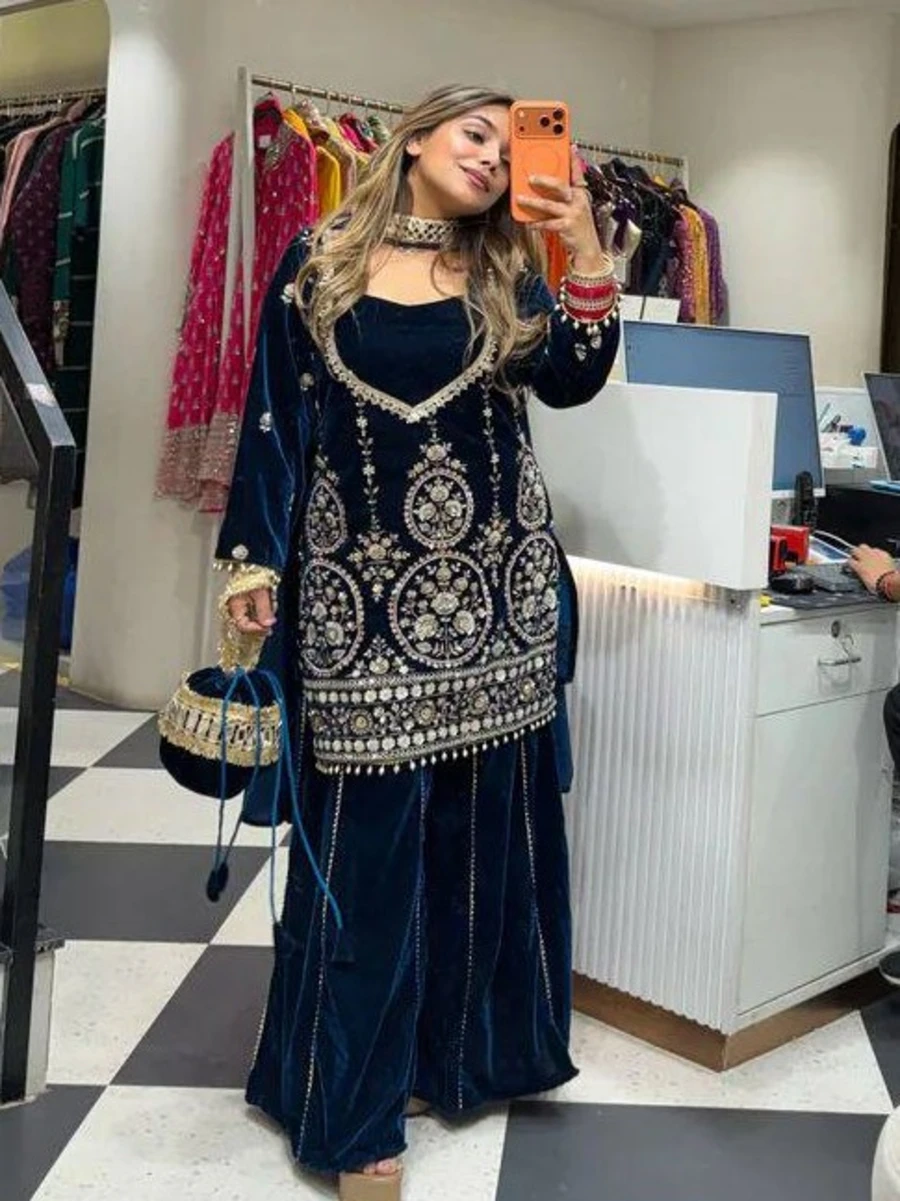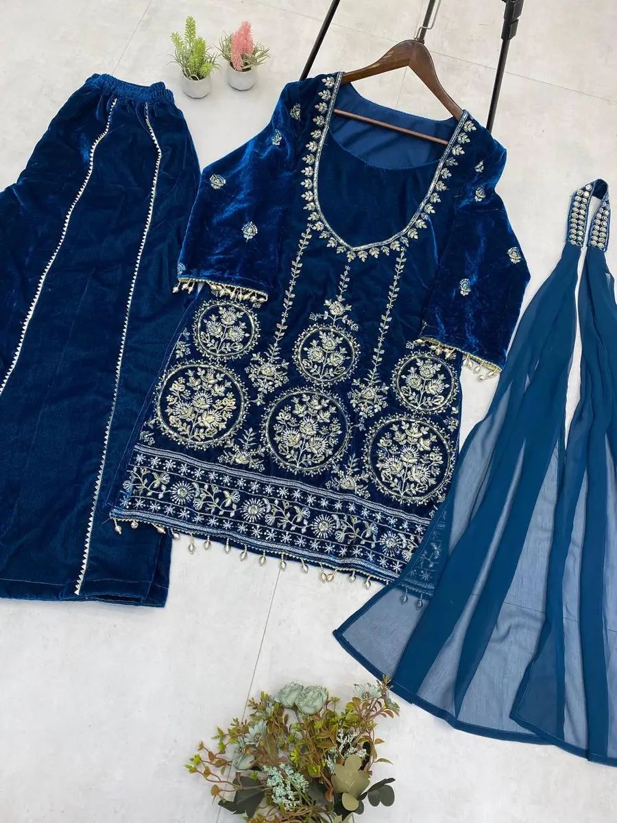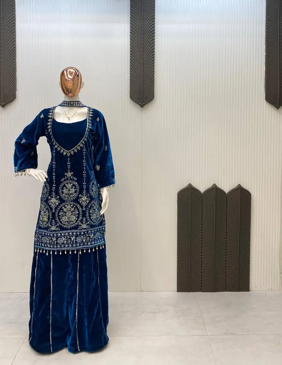 FANCY VELVET SEQUENCE EMBROIDERY WORK TOP PALAZZO WITH DUPATTA BLUE