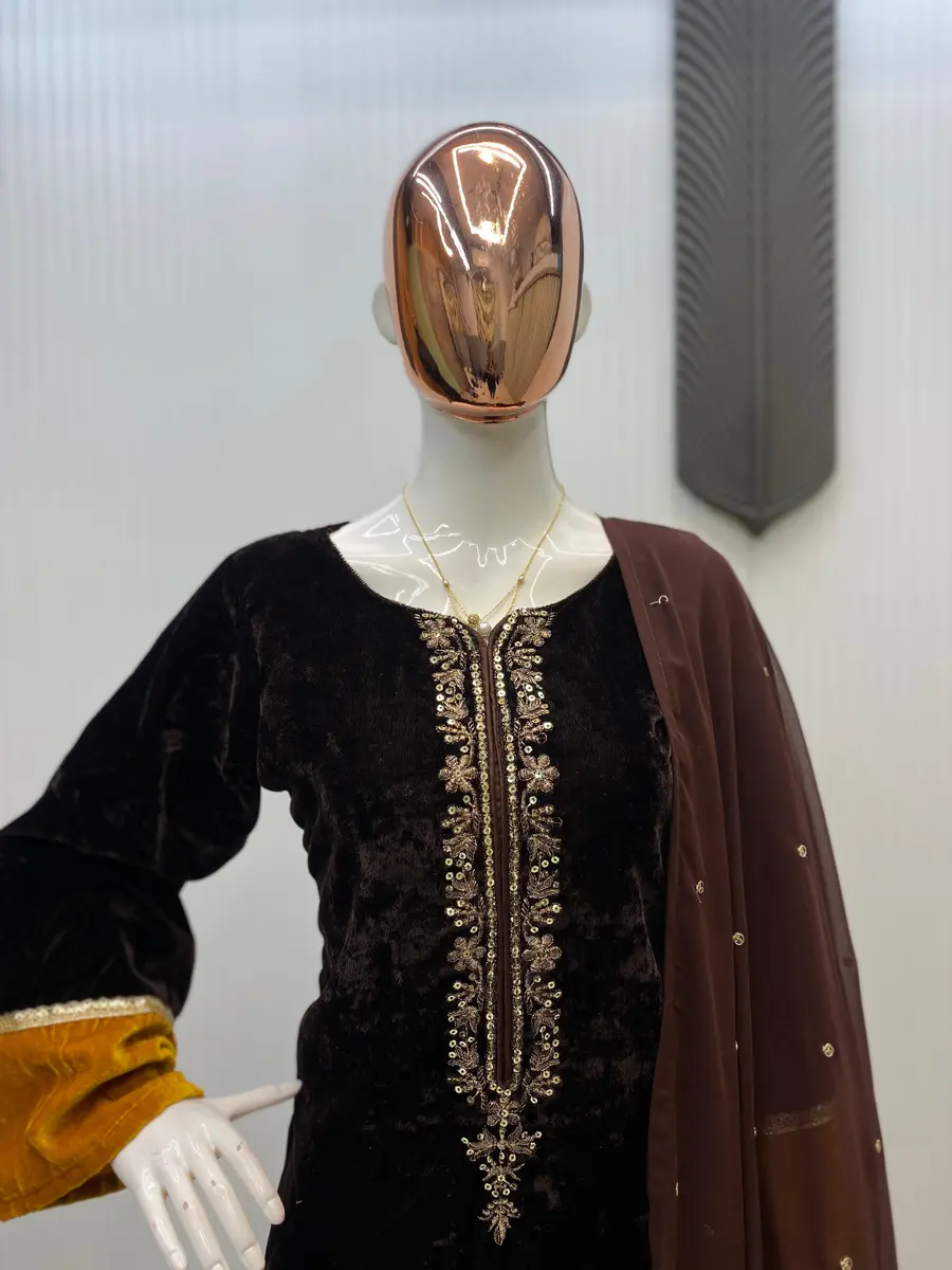 FANCY VELVET SEQUENCE EMBROIDERY WORK TOP PALAZZO WITH DUPATTA BROWN