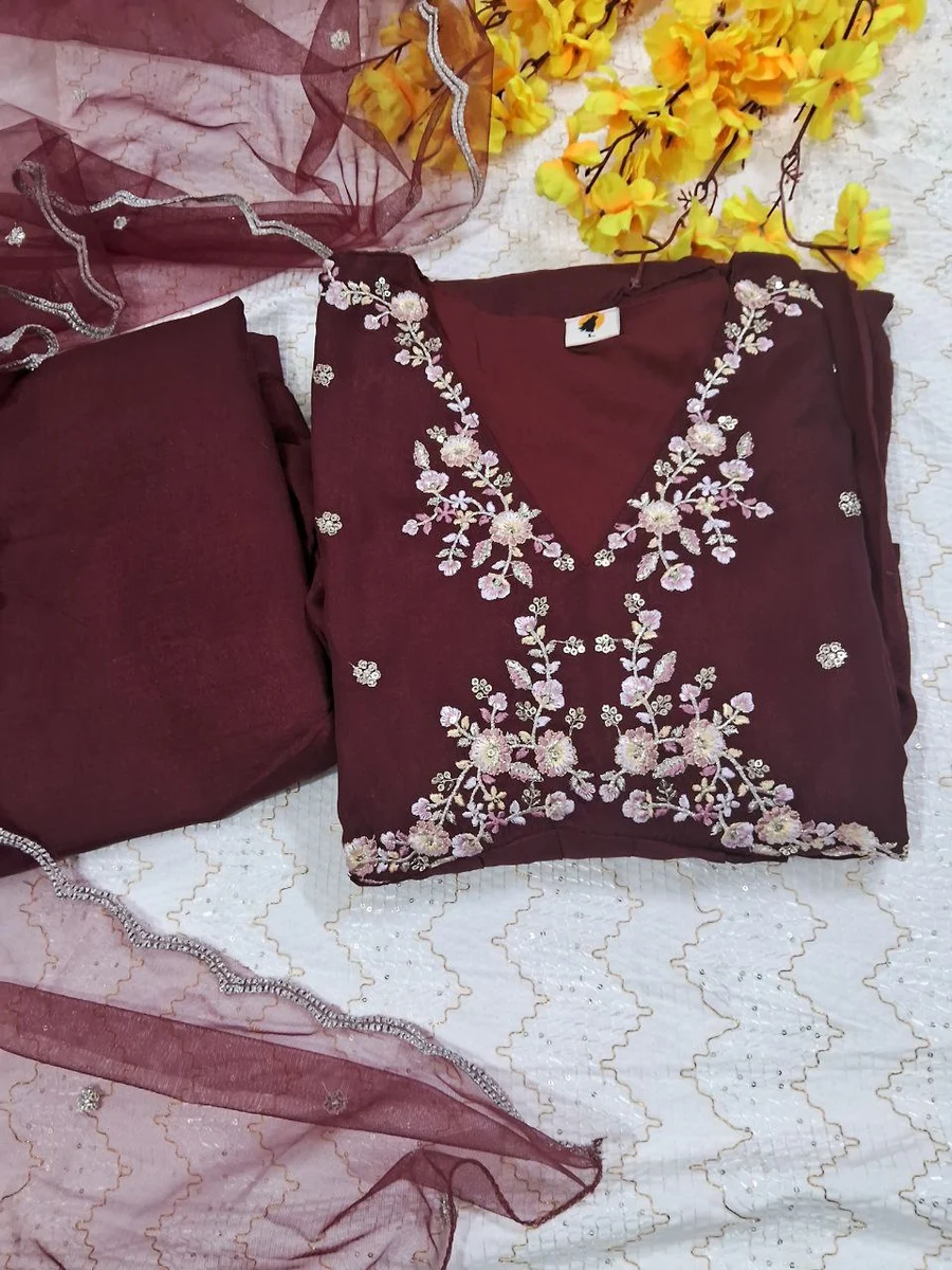 FANCY VICHITRA SILK EMBROIDERY WORK TOP BOTTOM WITH DUPATTA MAROON