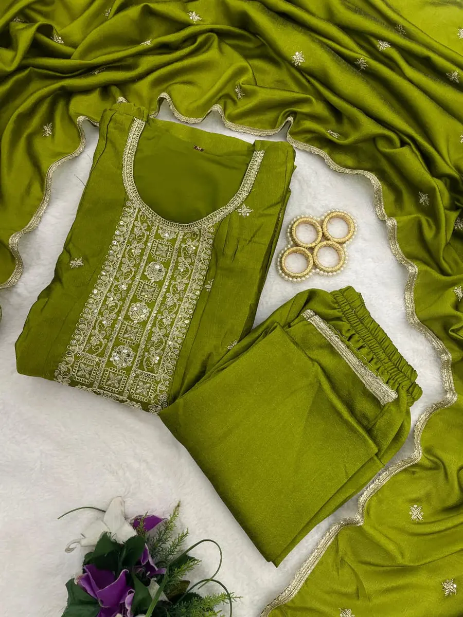 FANCY VICHITRA SILK EMBROIDERY WORK TOP BOTTOM WITH DUPATTA PARROT GREEN