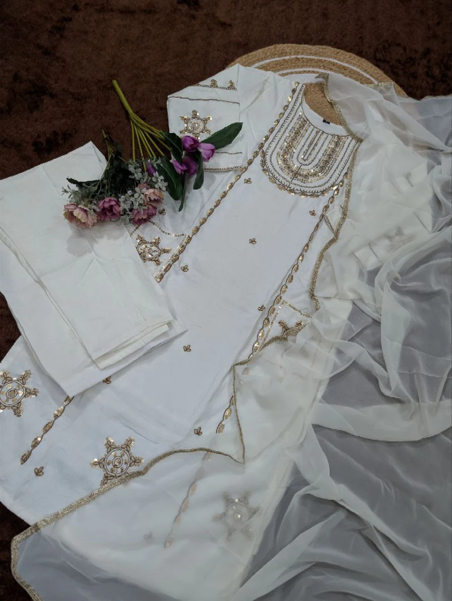 FANCY VICHITRA SILK SEQUENCE CODING EMBROIDERY WORK TOP BOTTOM WITH DUPATTA OFF WHITE