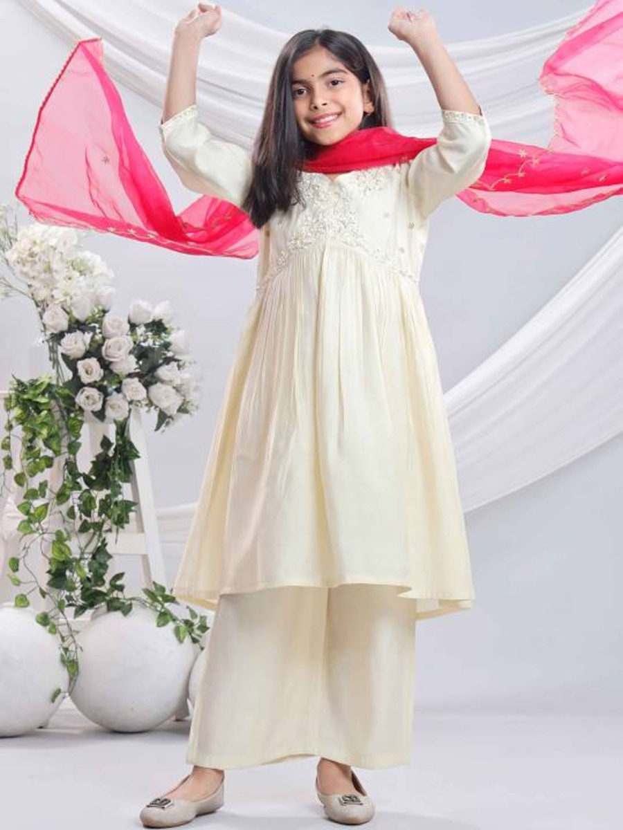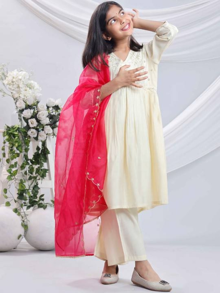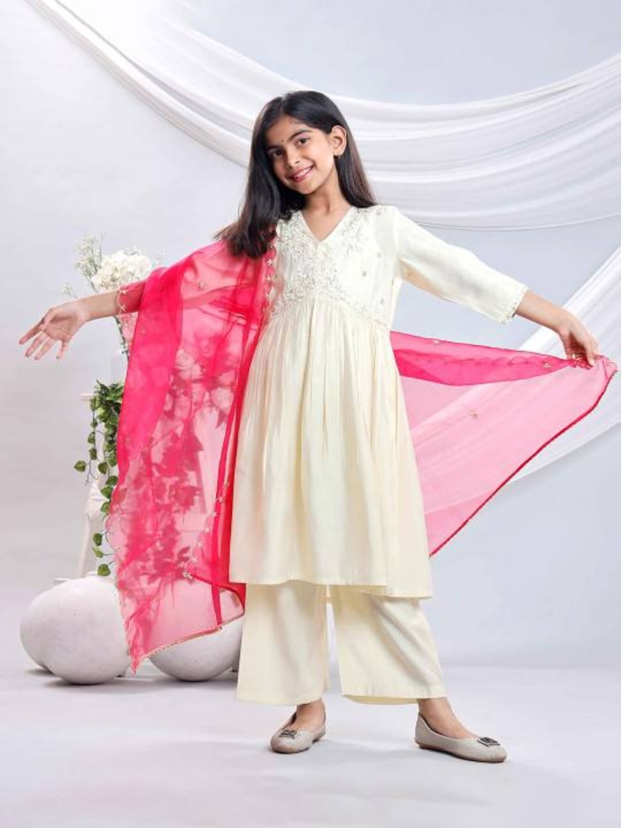 FANCY VISCOSE EMBROIDERY SEQUENCE WORK KID’S TOP BOTTOM WITH DUPATTA OFF WHITE + PINK