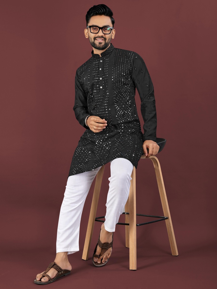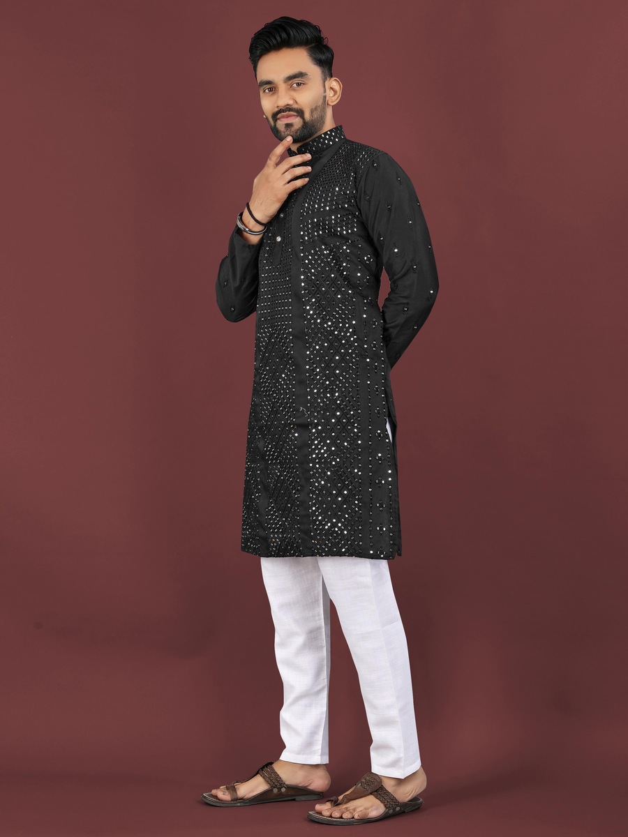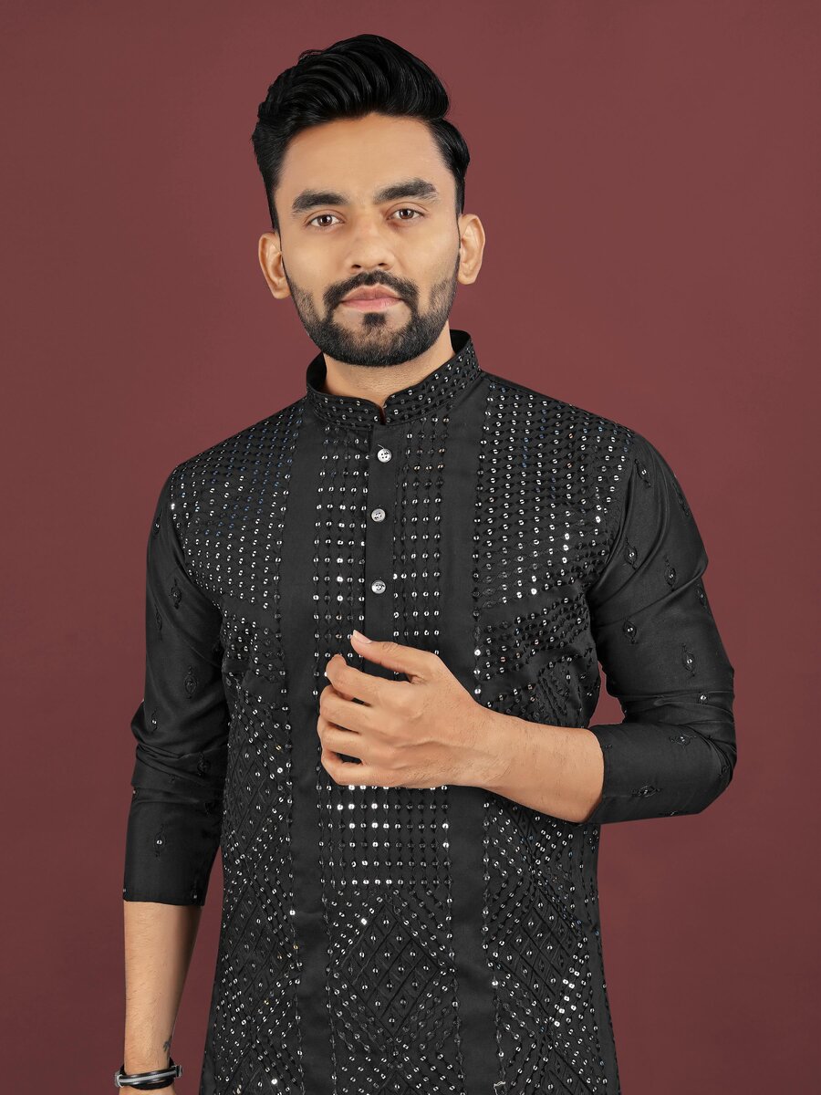 FANCY VISCOSE SILK EMBROIDERY SEQUENCE WORK MEN’S KURTA PAYJAMA BLACK