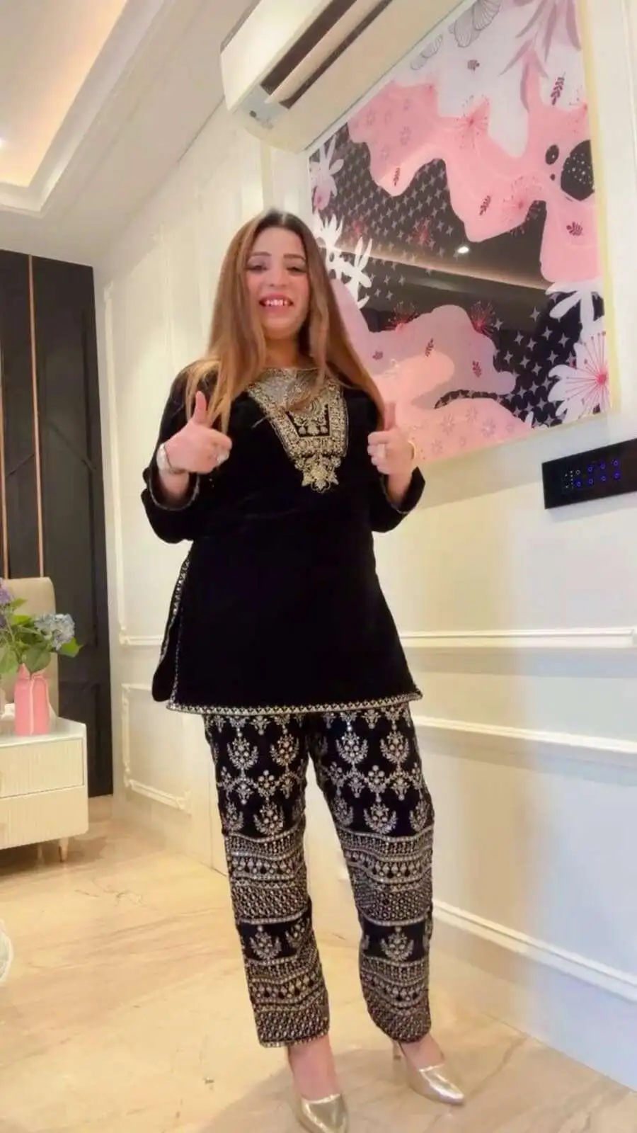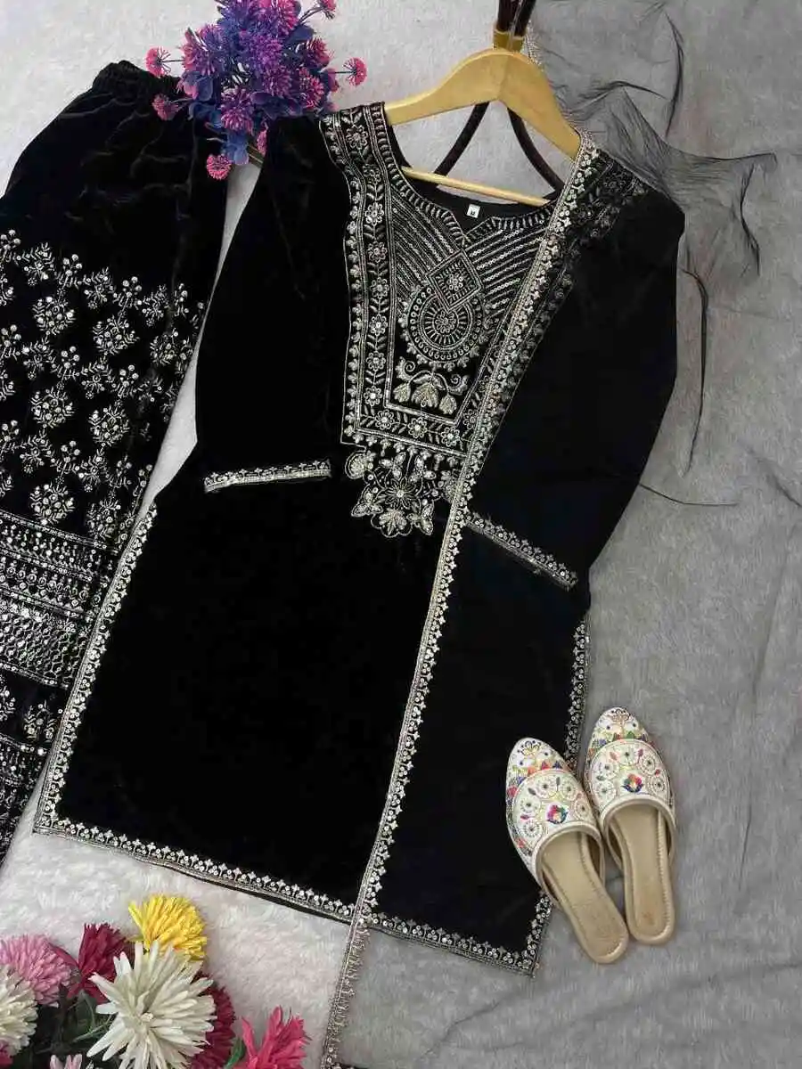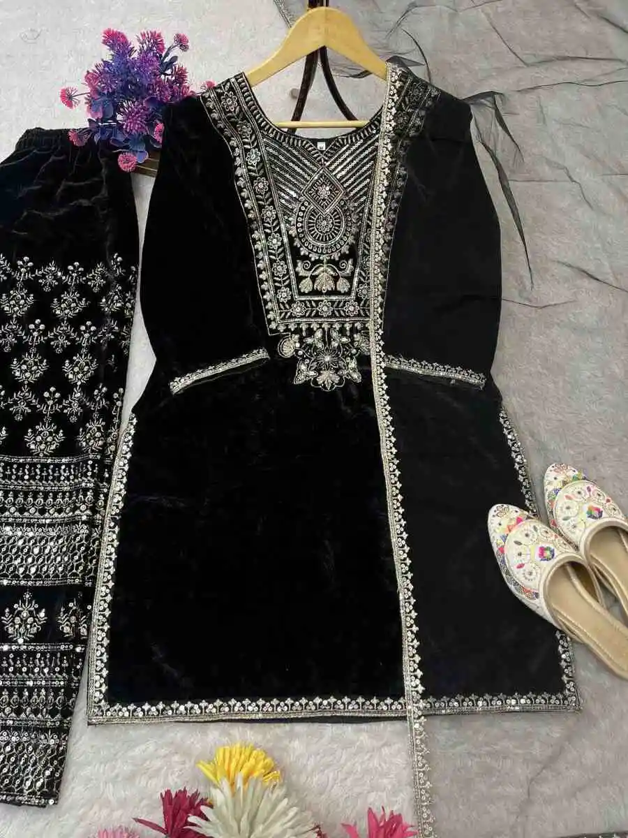 FANCY VISCOSE VELVET EMBROIDERY SEQUENCE WORK TOP BOTTOM WITH DUPATTA BLACK