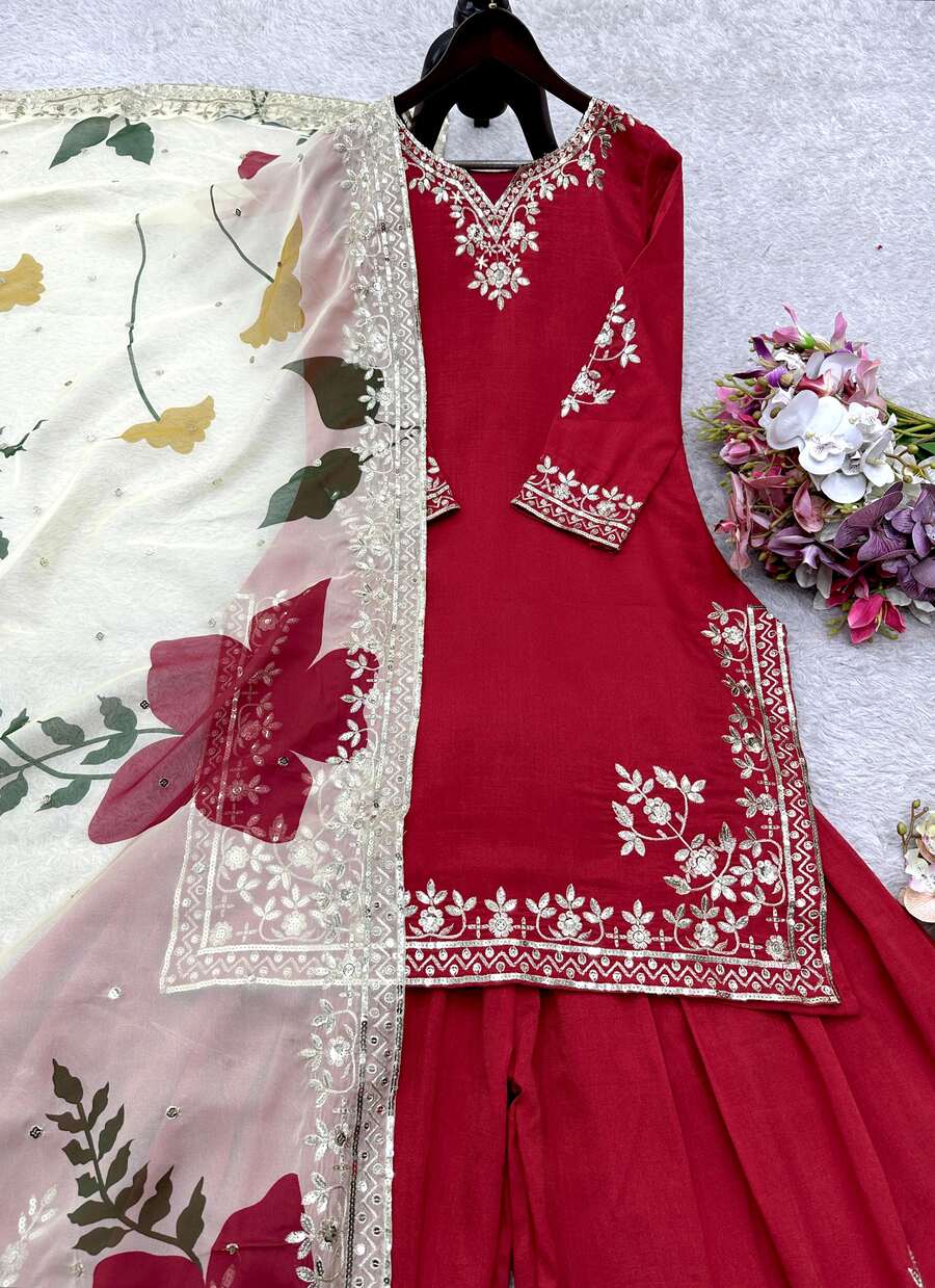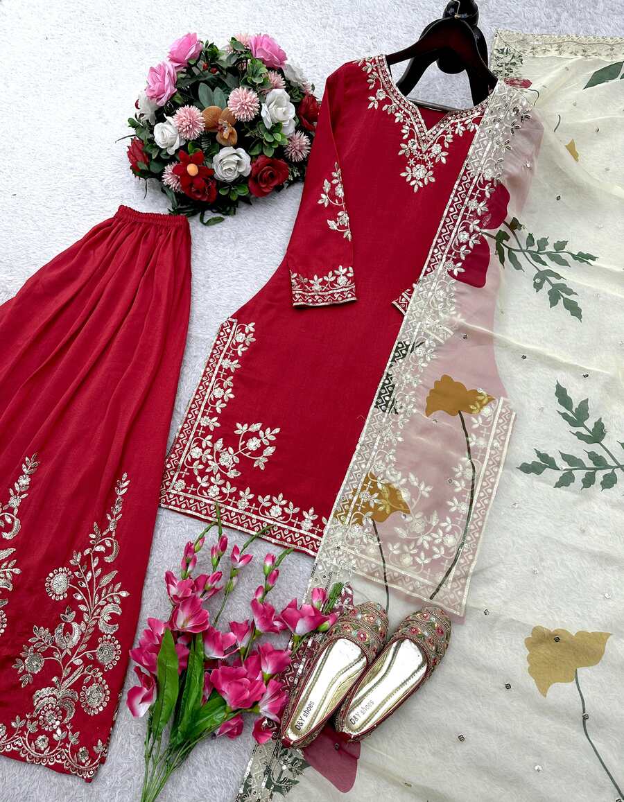 FASHIONABLE CHINON SILK EMBROIDERY SEQUENCE WORK TOP PALAZZO WITH DUPATTA RED