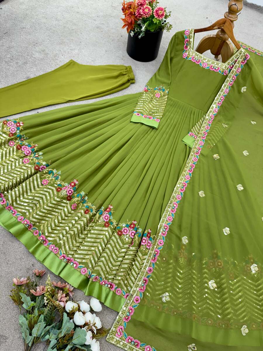 FASHIONABLE GEORGETTE MULTI THREAD HEAVY EMBROIDERY SEQUENCE WORK GOWN BOTTOM WITH DUPATTA GREEN