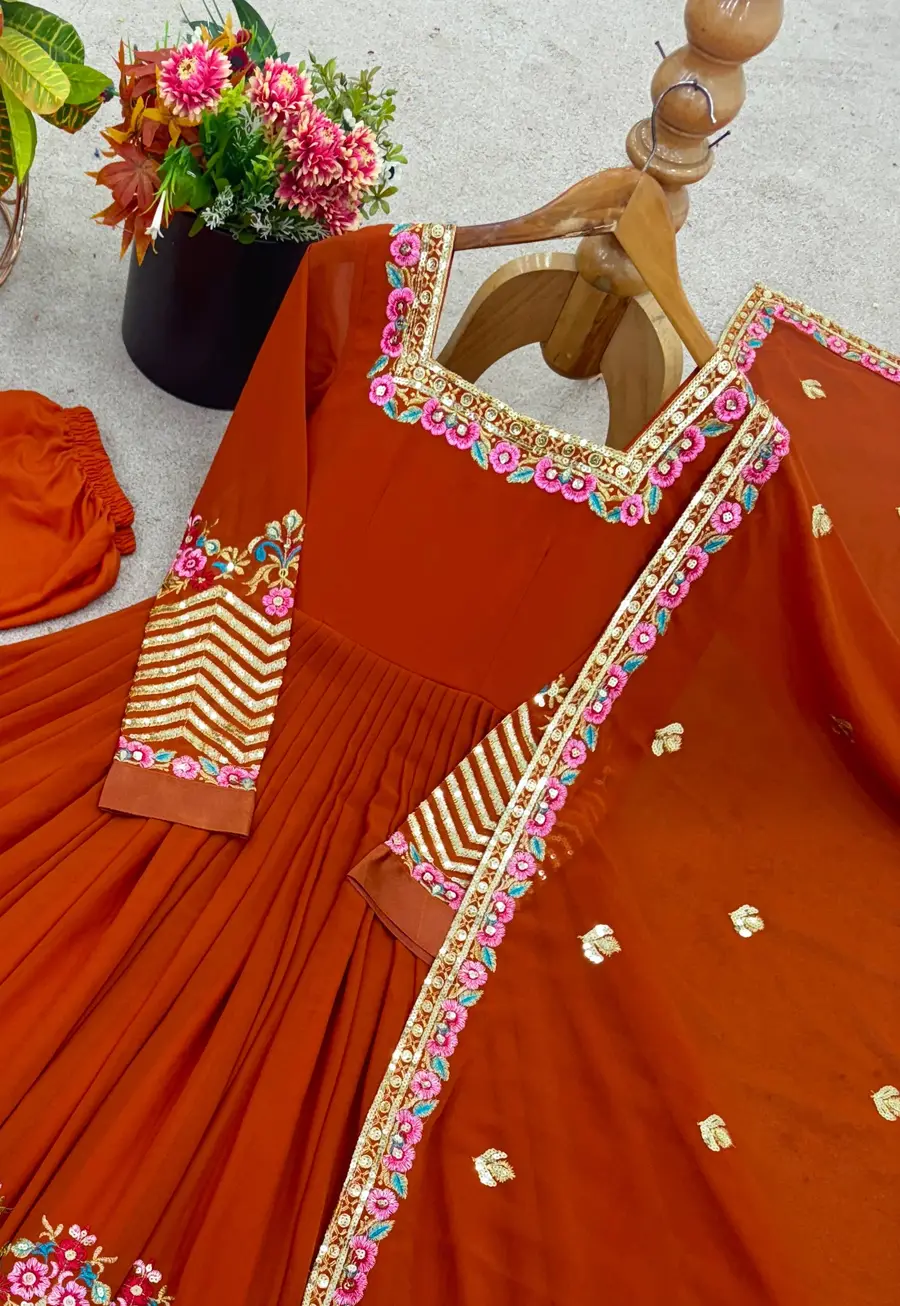 FASHIONABLE GEORGETTE MULTI THREAD HEAVY EMBROIDERY SEQUENCE WORK GOWN BOTTOM WITH DUPATTA ORANGE