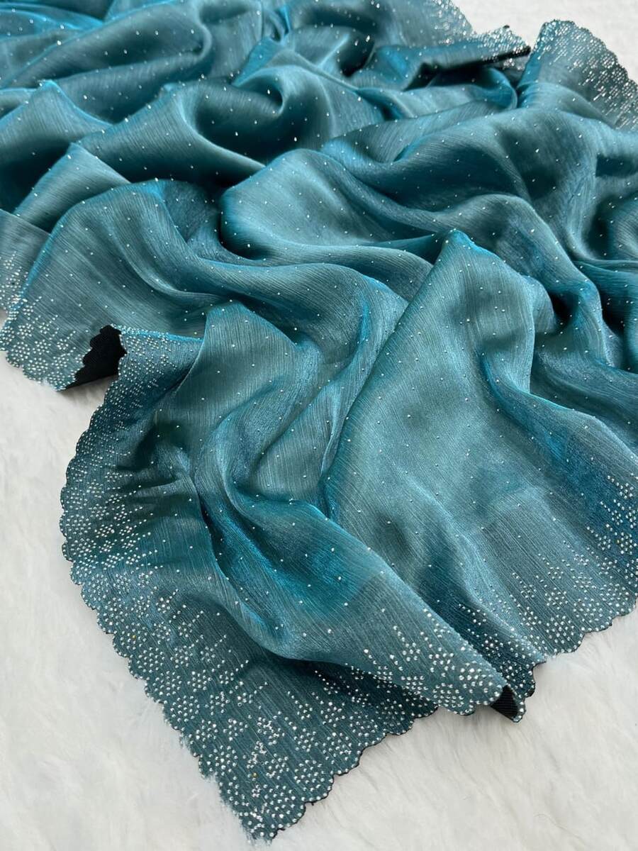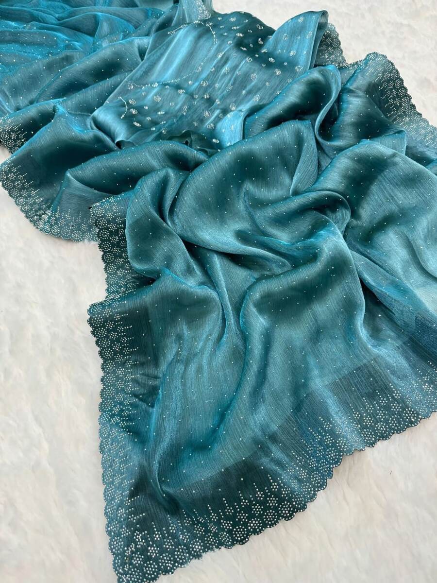 FASHIONABLE JIMMY CHOO SILK DAIMOND WITH CUT WORK SAREE WITH UNSTITCHE BLOUSE TEAL
