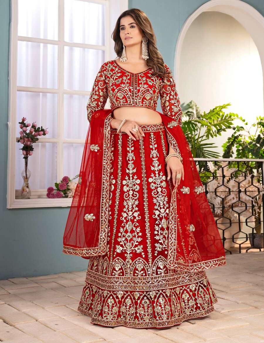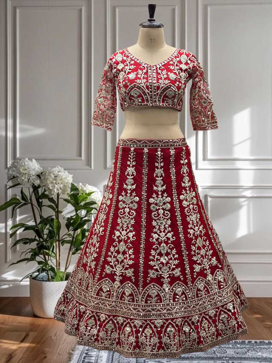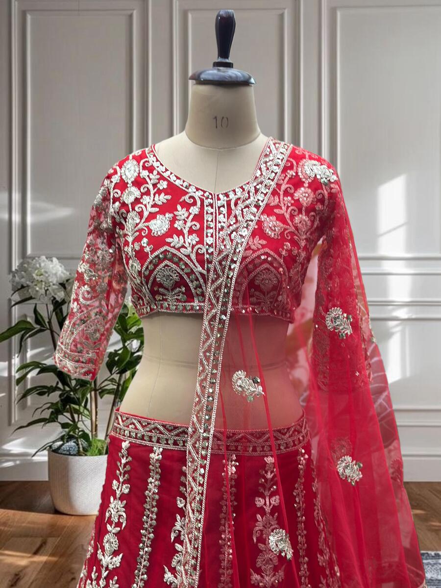 FASHIONABLE NET EMBROIDERY SEQUENCE DESIGN WORK LEHENGA CHOLI WITH DUPATTA RED
