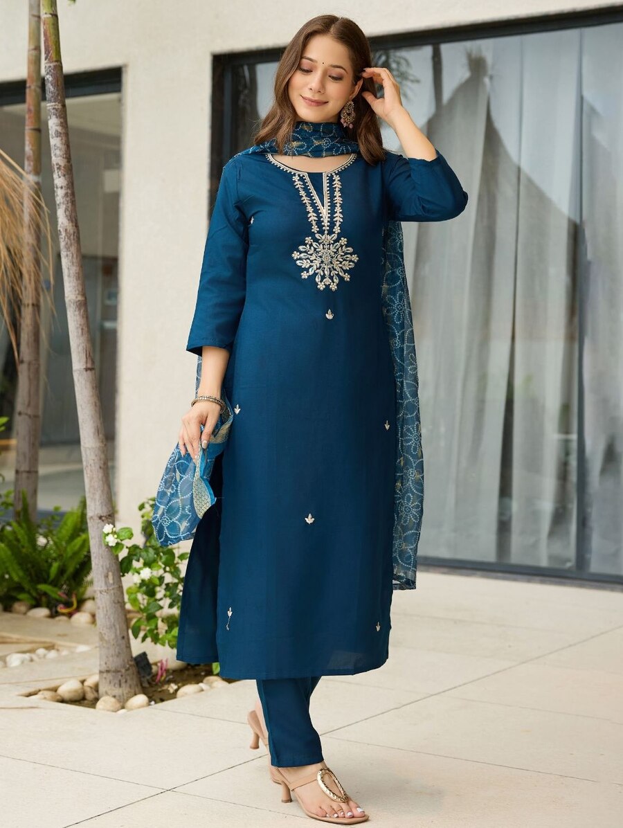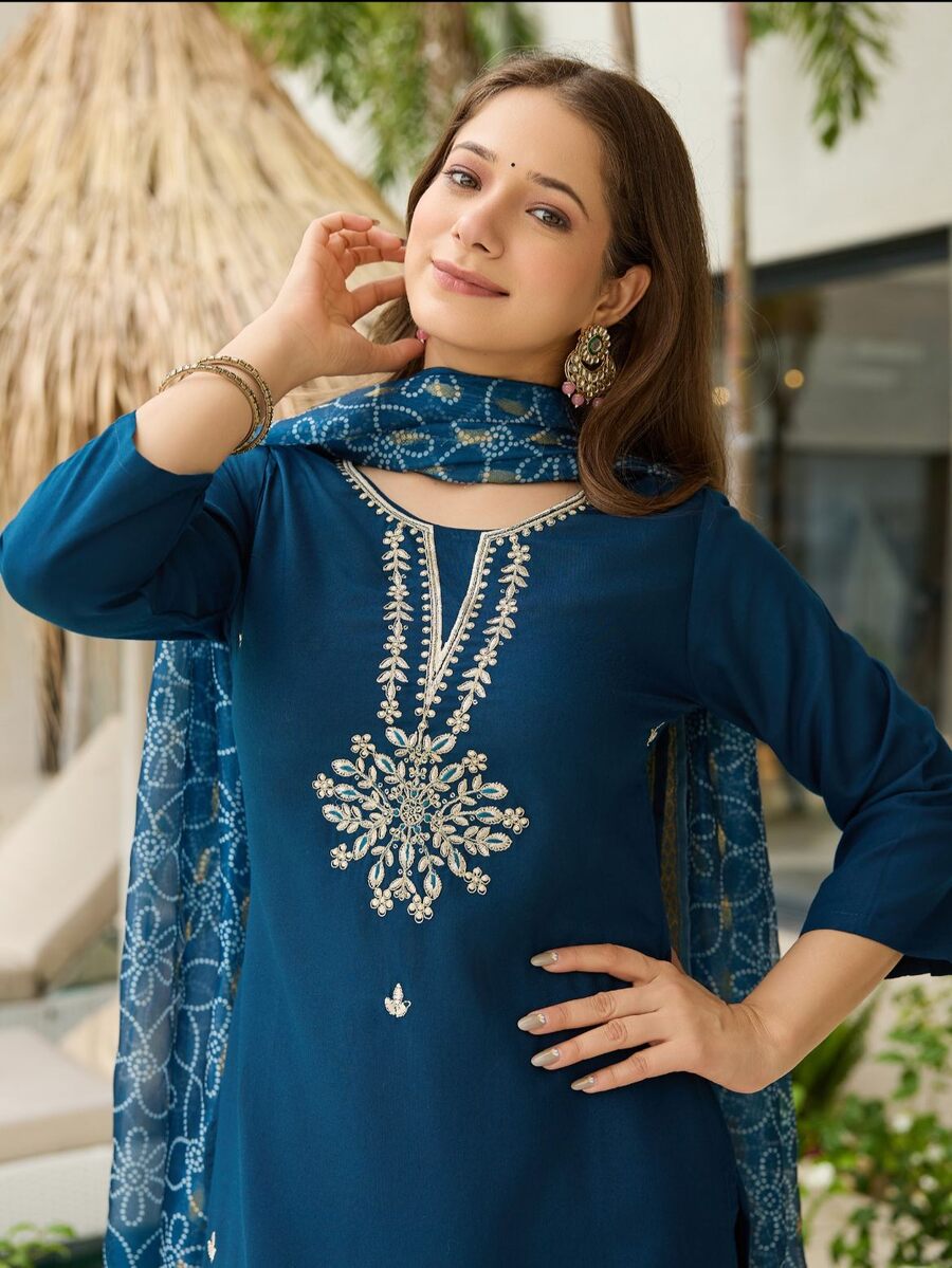 FASHIONABLE RAYON EMBROIDERY WORK TOP BOTTOM WITH DUPATTA TEAL