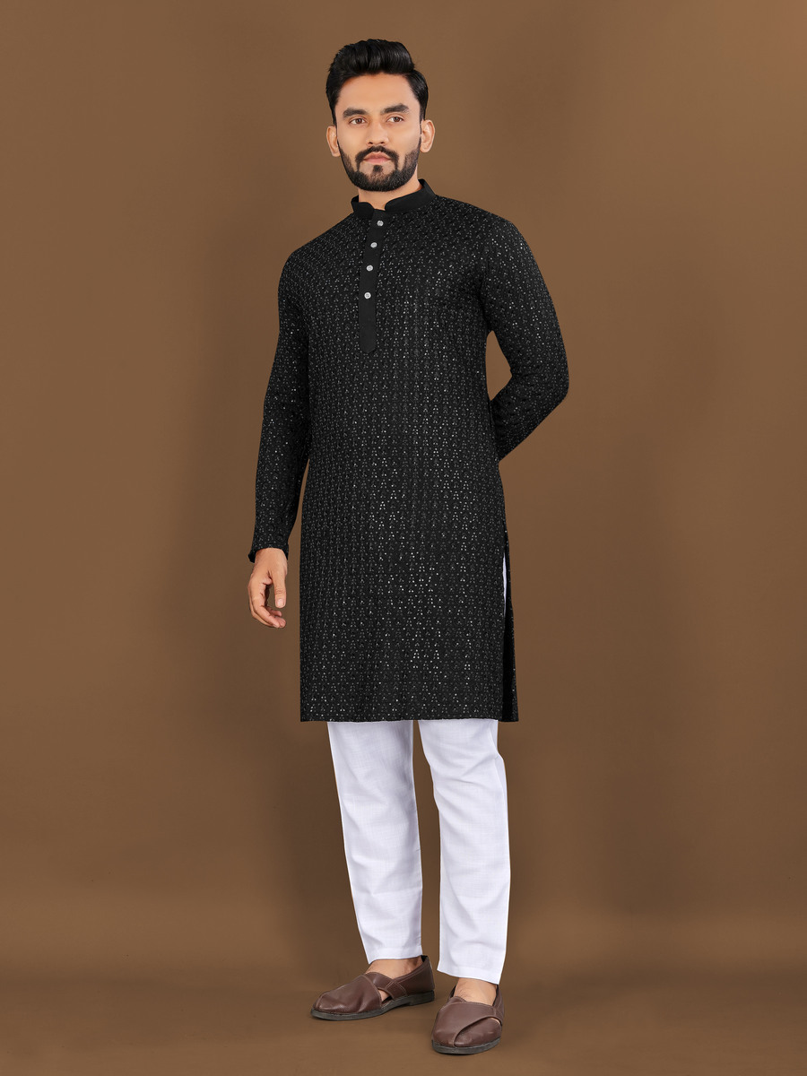 FASHIONABLE RAYON HEAVY EMBROIDERY WITH SEQUENCE WORK KURTA PAYJAMA BLACK