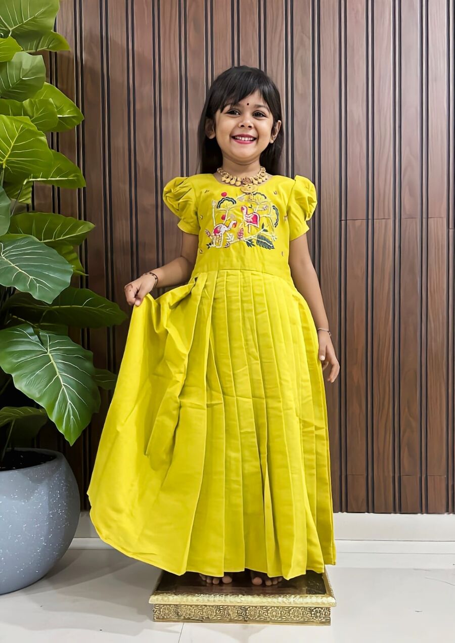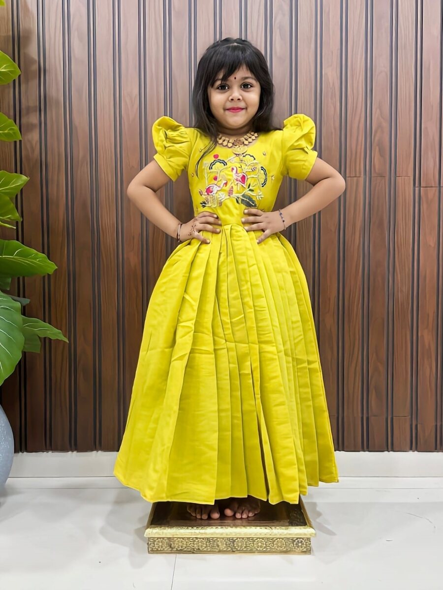 FASHIONABLE ROMAN COTTON SILK HANDWORK WITH MULTI EMBROIDERY WORK KID’S GOWN YELLOW