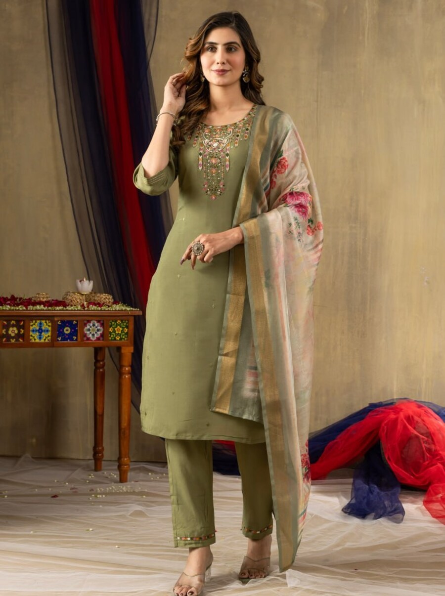FASHIONABLE SHIMMER GOLD SILK MULTI EMBROIDERY THREAD, WITH HAND WORK TOP BOTTOM WITH DUPATTA MEHNDI