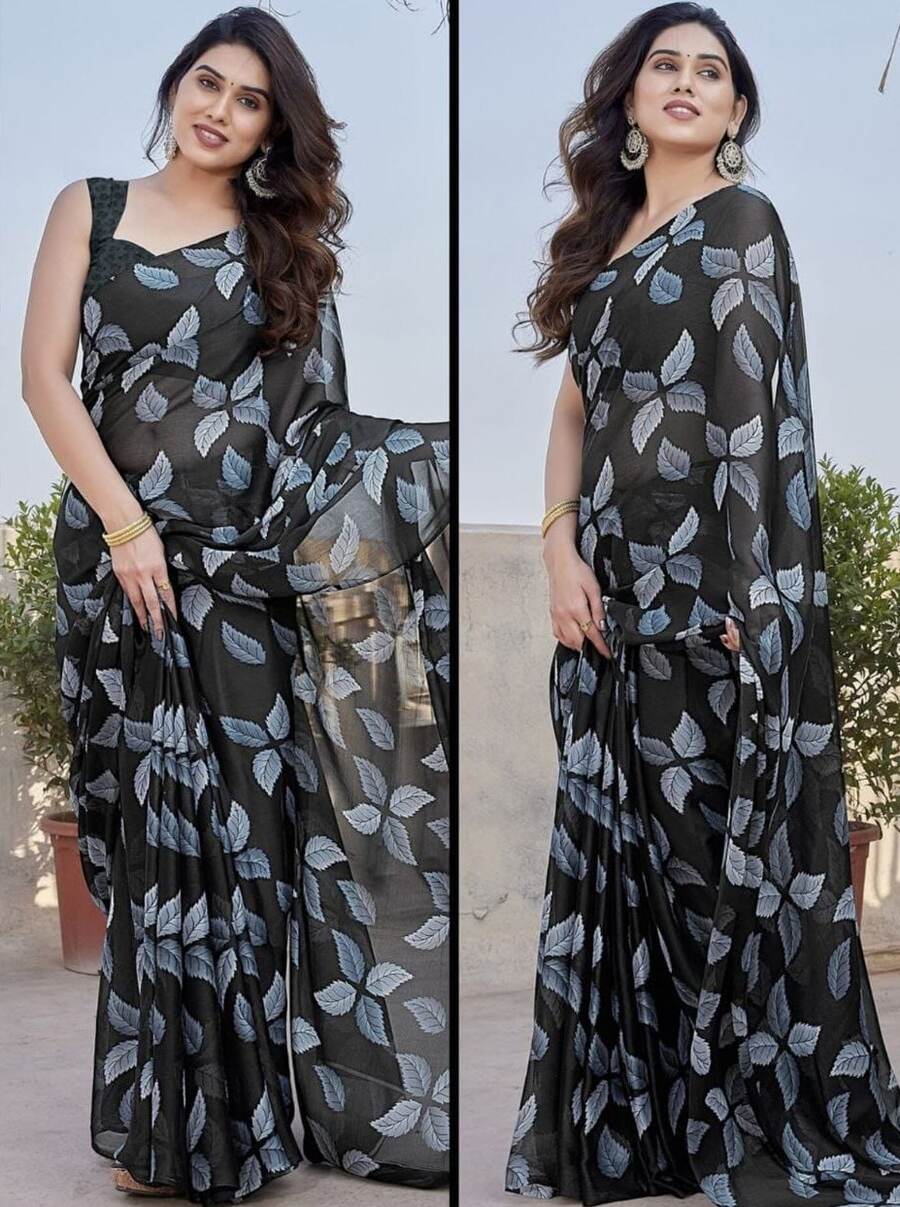 FASHIONABLE SMOOTH CHIFFON DIGITAL PRINT SAREE WITH UNSTITCHED BLOUSE BLACK