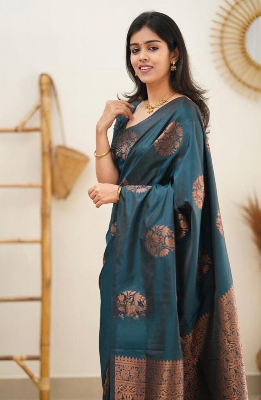 FASHIONABLE SOFT LICHI SILK JACQUARD WORK SAREE WITH UNSTITCHED BLOUSE TEAL