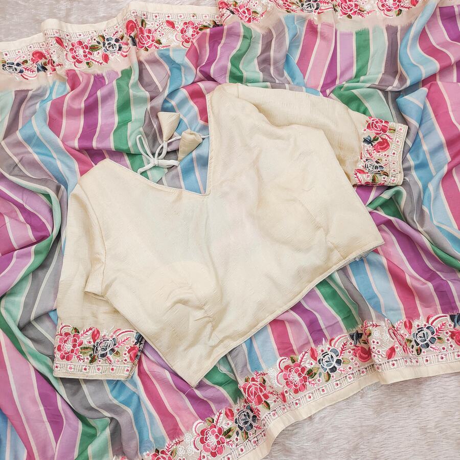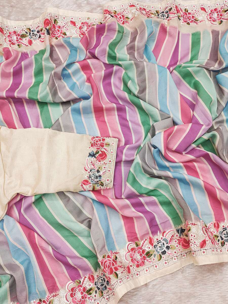 FASHIONABLE VICHITRA SILK DIGITAL PRINTED EMBROIDERY THREAD WORK SAREE WITH UNSTITCHED BLOUSE MULTI