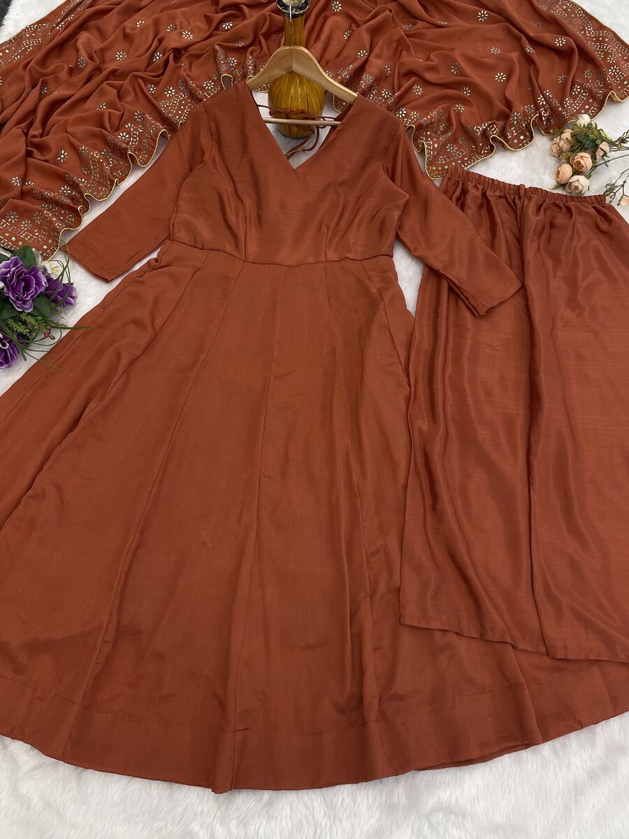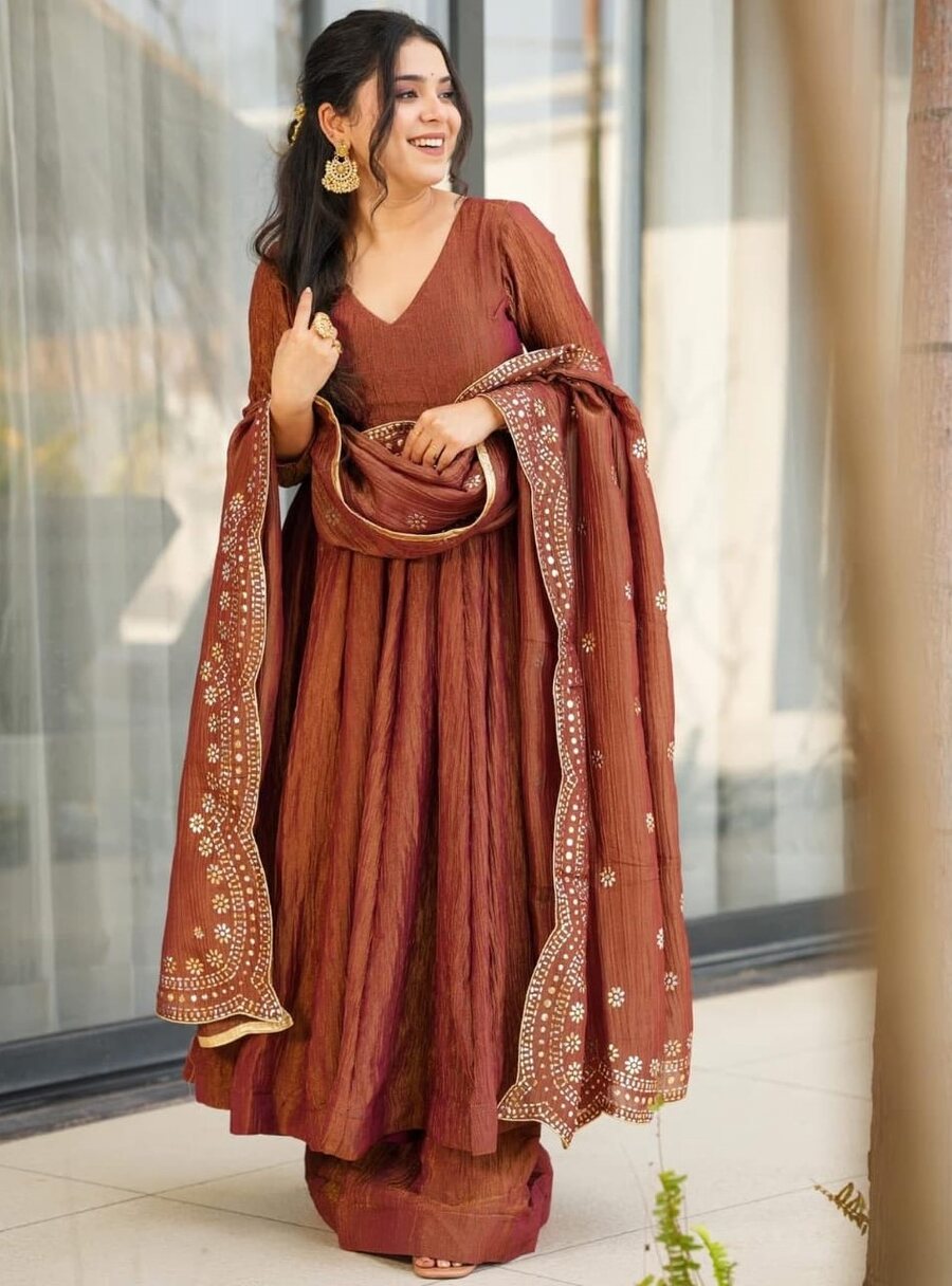 FASHIONABLE VISCOSE CHINON PLAIN TOP PALAZZO WITH DUPATTA SEQUENCE CODING EMBROIDERY WORK DUPATTA BROWN