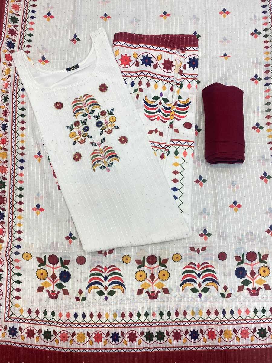 FESTIVAL WEAR MUSLIN PRINT WITH HANDWORK AND SEQUENCE WORK TOP BOTTOM WITH DUPATTA WHITE WITH MAROON