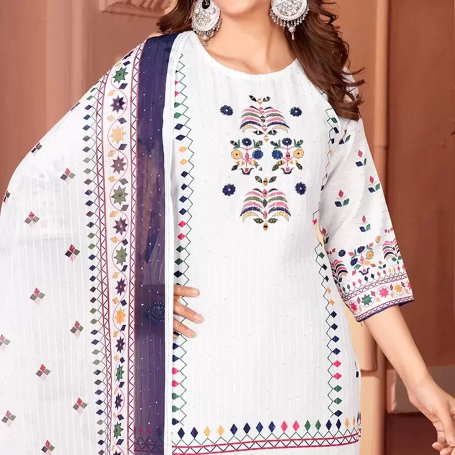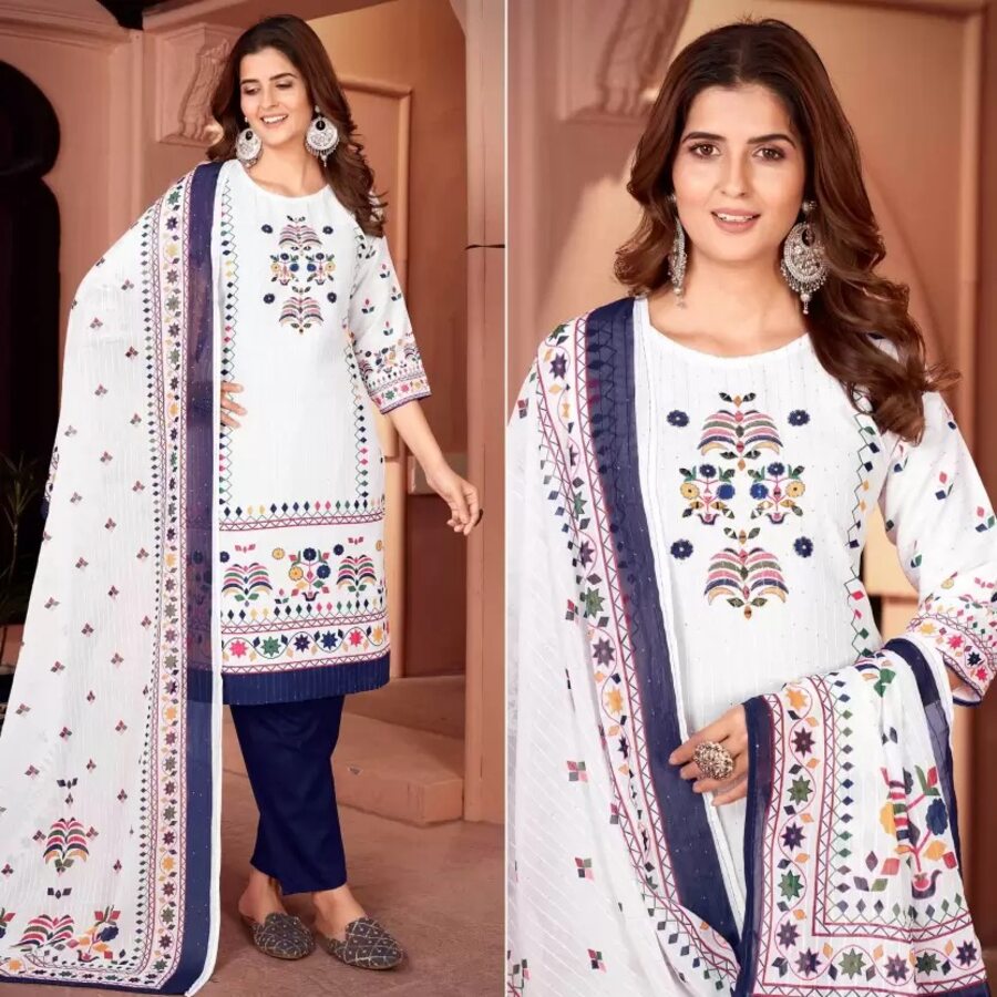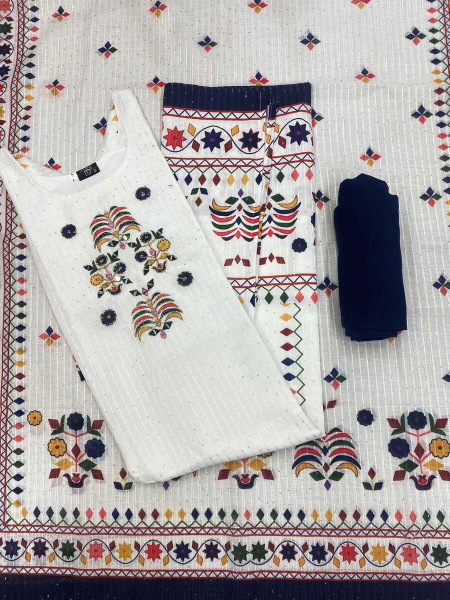 FESTIVAL WEAR MUSLIN PRINT WITH HANDWORK AND SEQUENCE WORK TOP BOTTOM WITH DUPATTA WHITE WITH NAVY BLUE