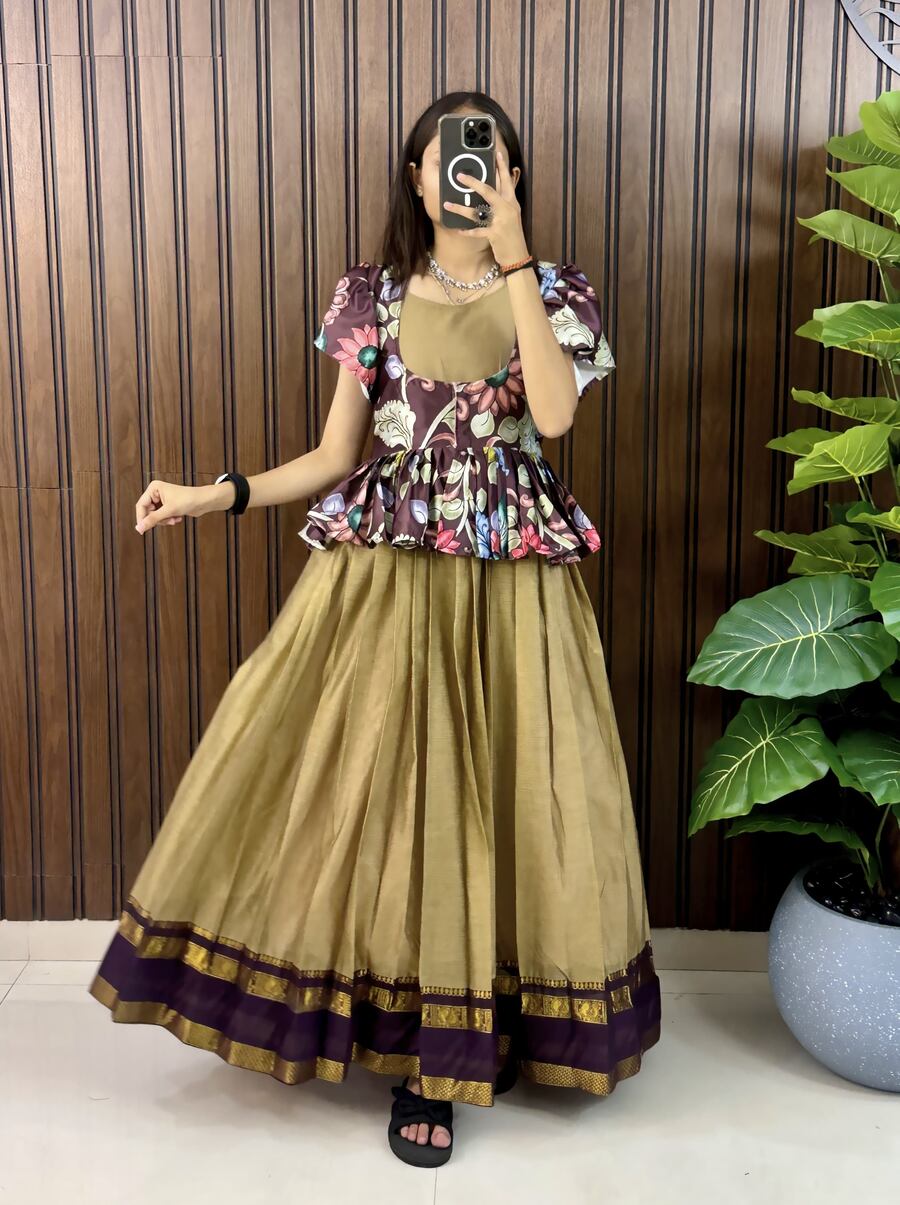 GORGEOUS COTTON SILK DIGITAL PRINT AND HEAVY ZARI BORDER GOWN WITH JACKET KHAKI