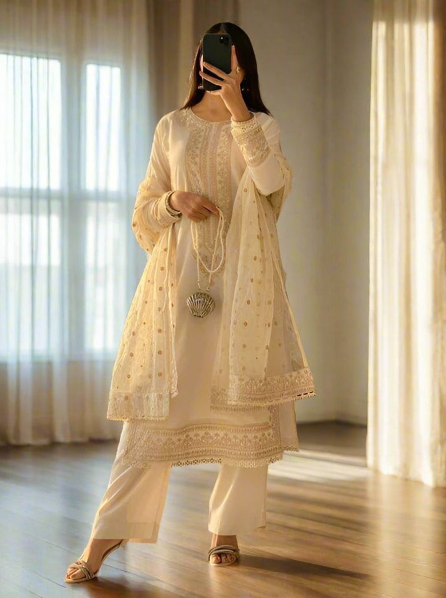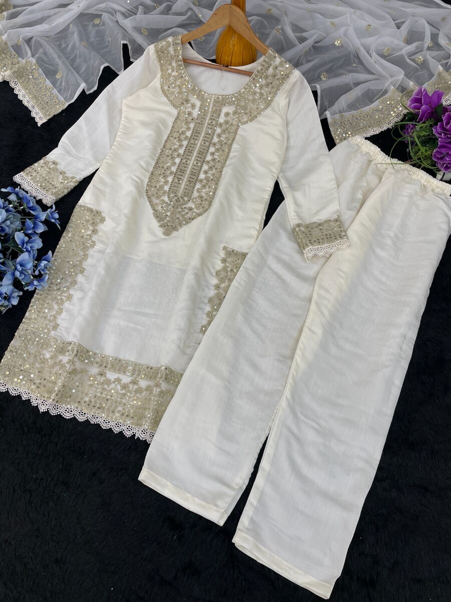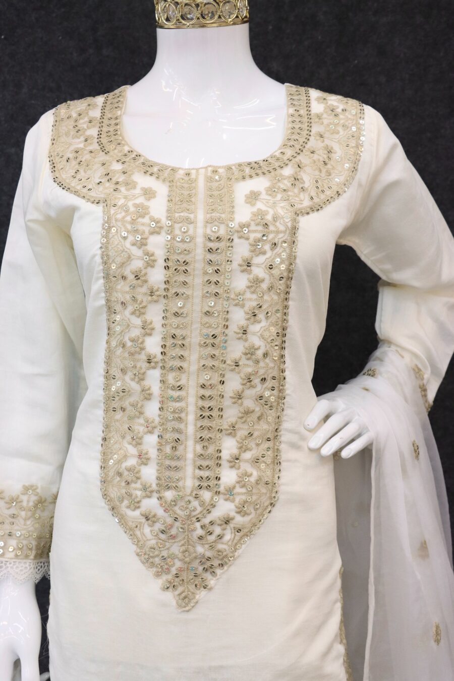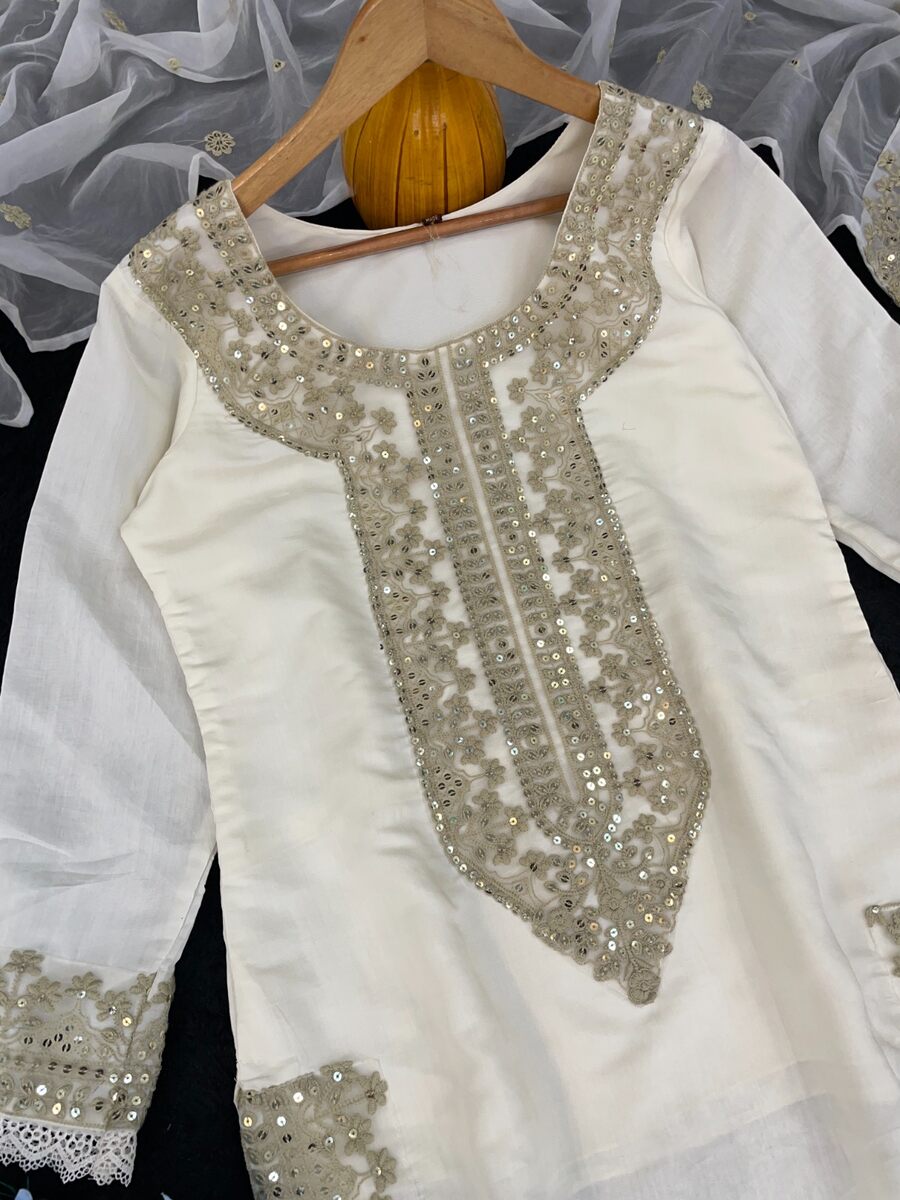 LATEST CHANDERI SILK EMBROIDERY SEQUENCE WORK TOP BOTTOM WITH DUPATTA OFF WHITE
