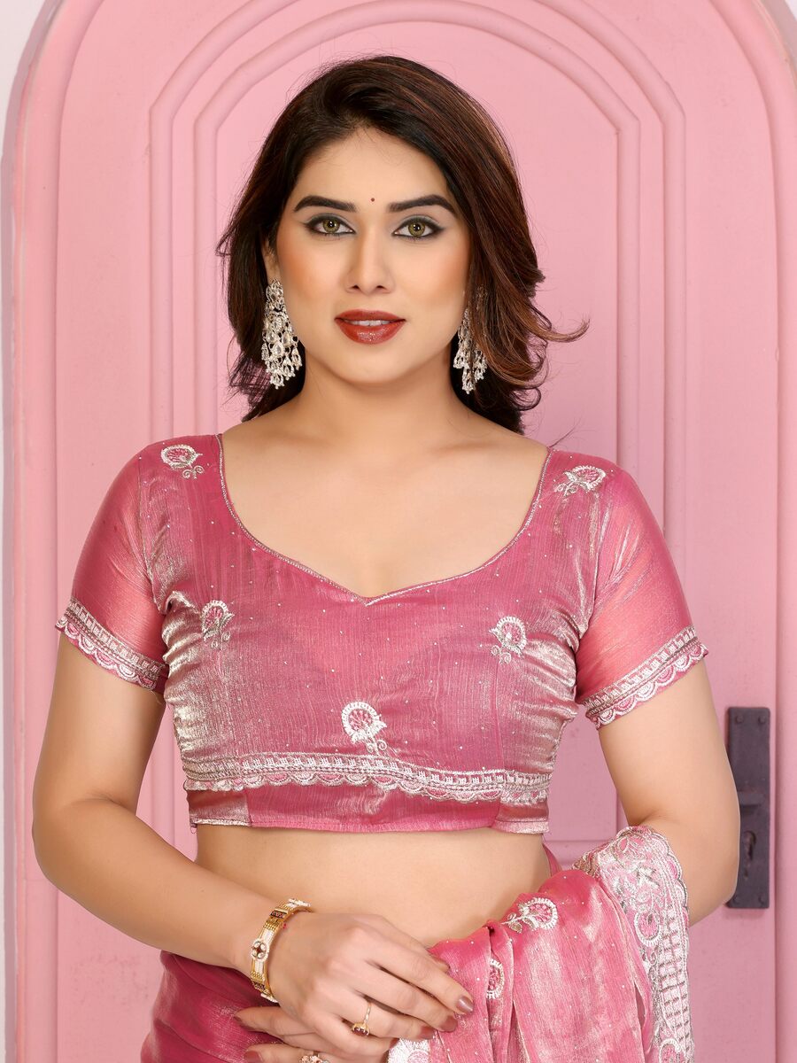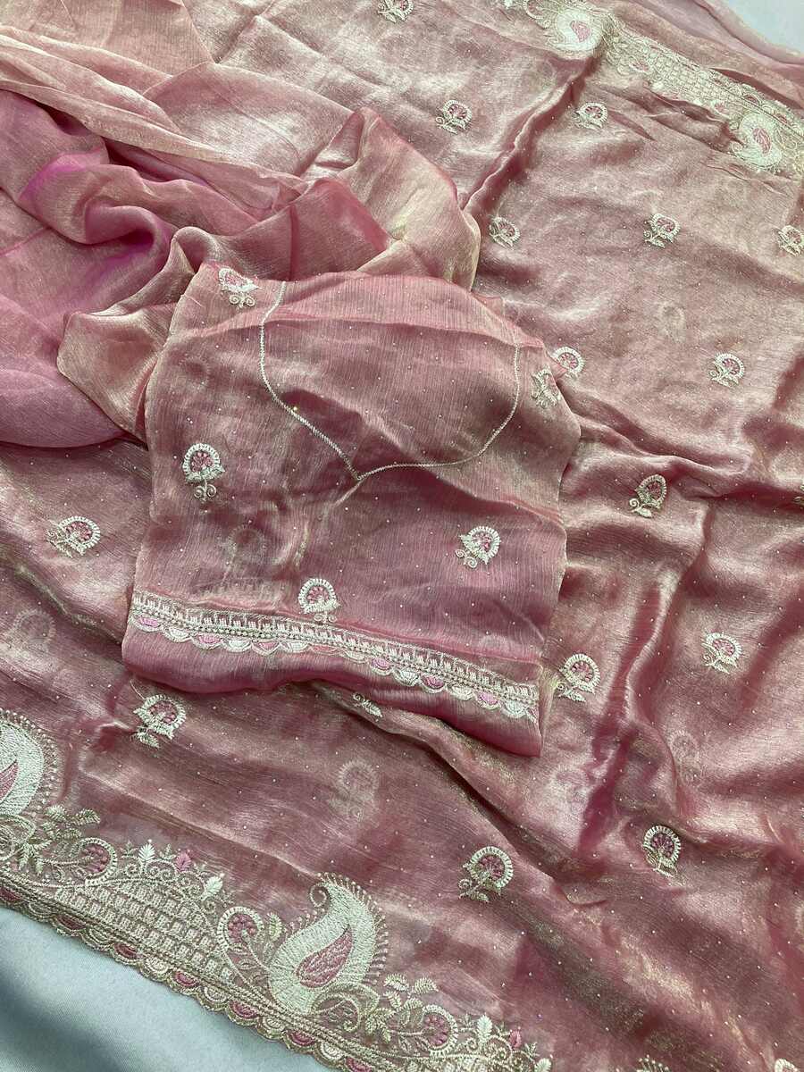 LATEST CHIFFON SILK EMBROIDERY WITH PIPING BORDER WORK SAREE WITH UNSTITCHED BLOUSE BABY PINK