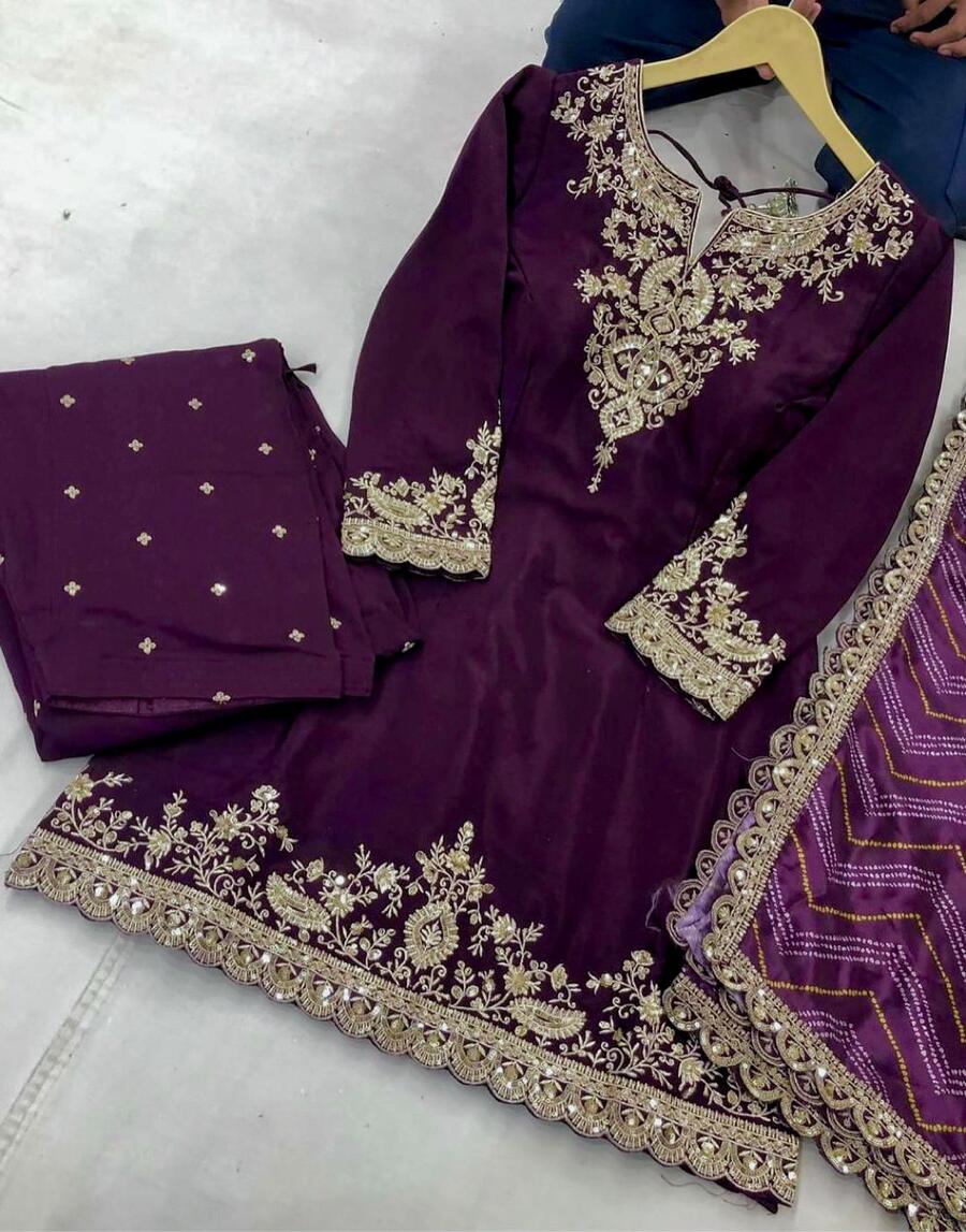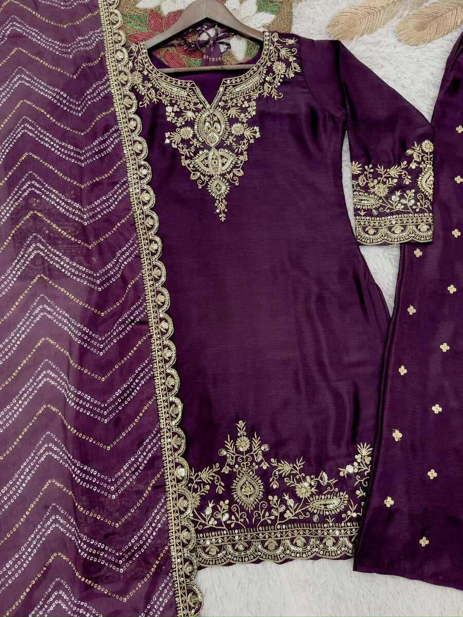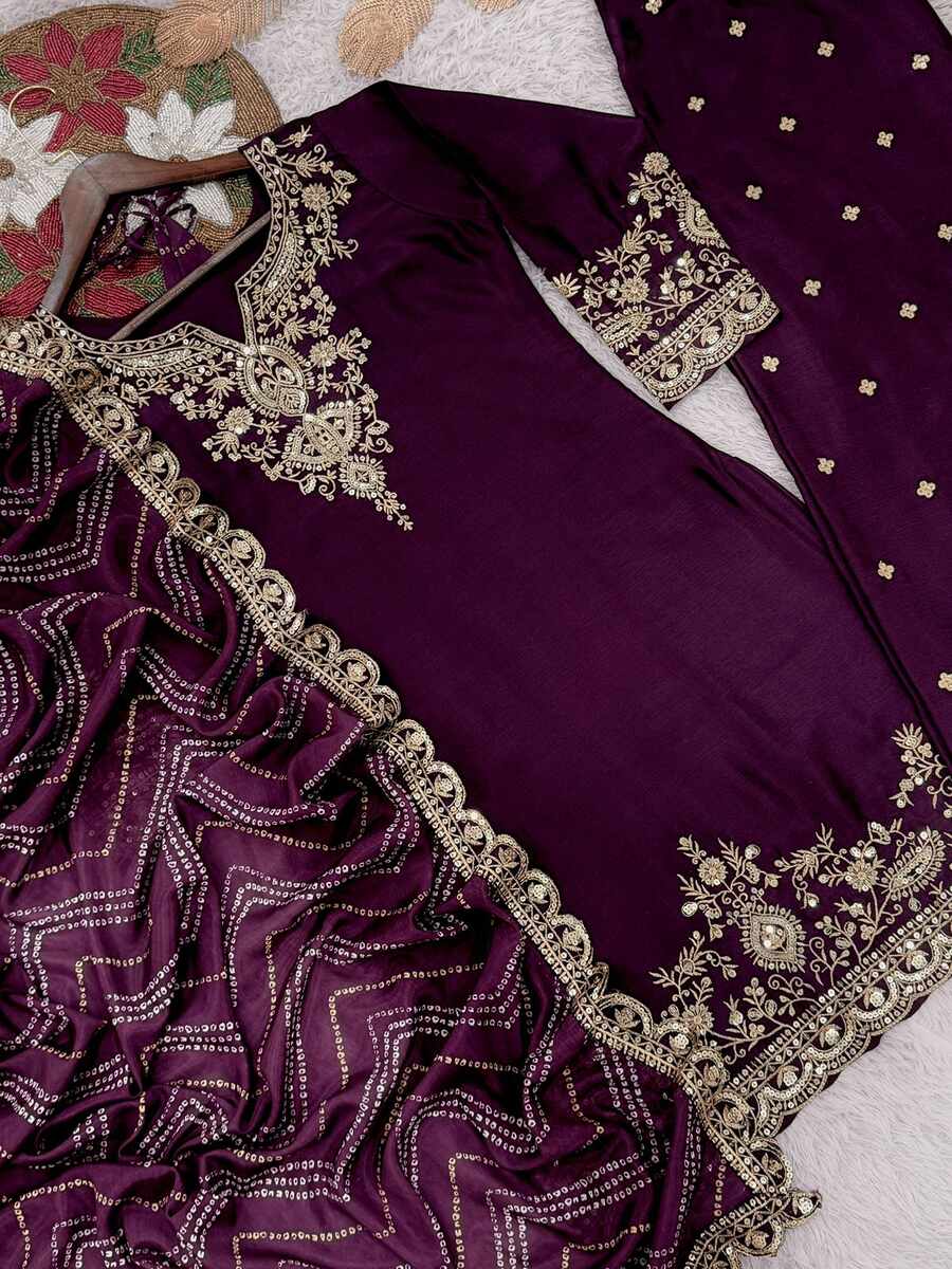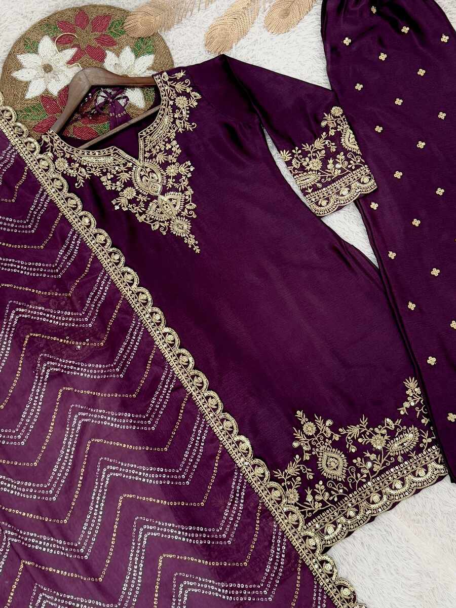 LATEST CHINON SILK DEMBROIDERY AND SEQUENCE WORK TOP PALAZZO WITH DUPATTA WINE