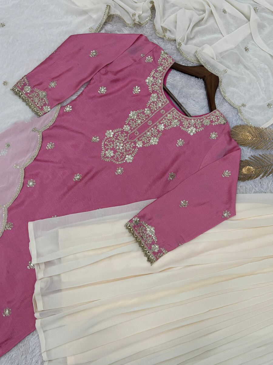 LATEST CHINON SILK EMBROIDERY SEQUENCE WORK WITH CODING WORK TOP PALAZZO WITH DUPATTA BABY PINK