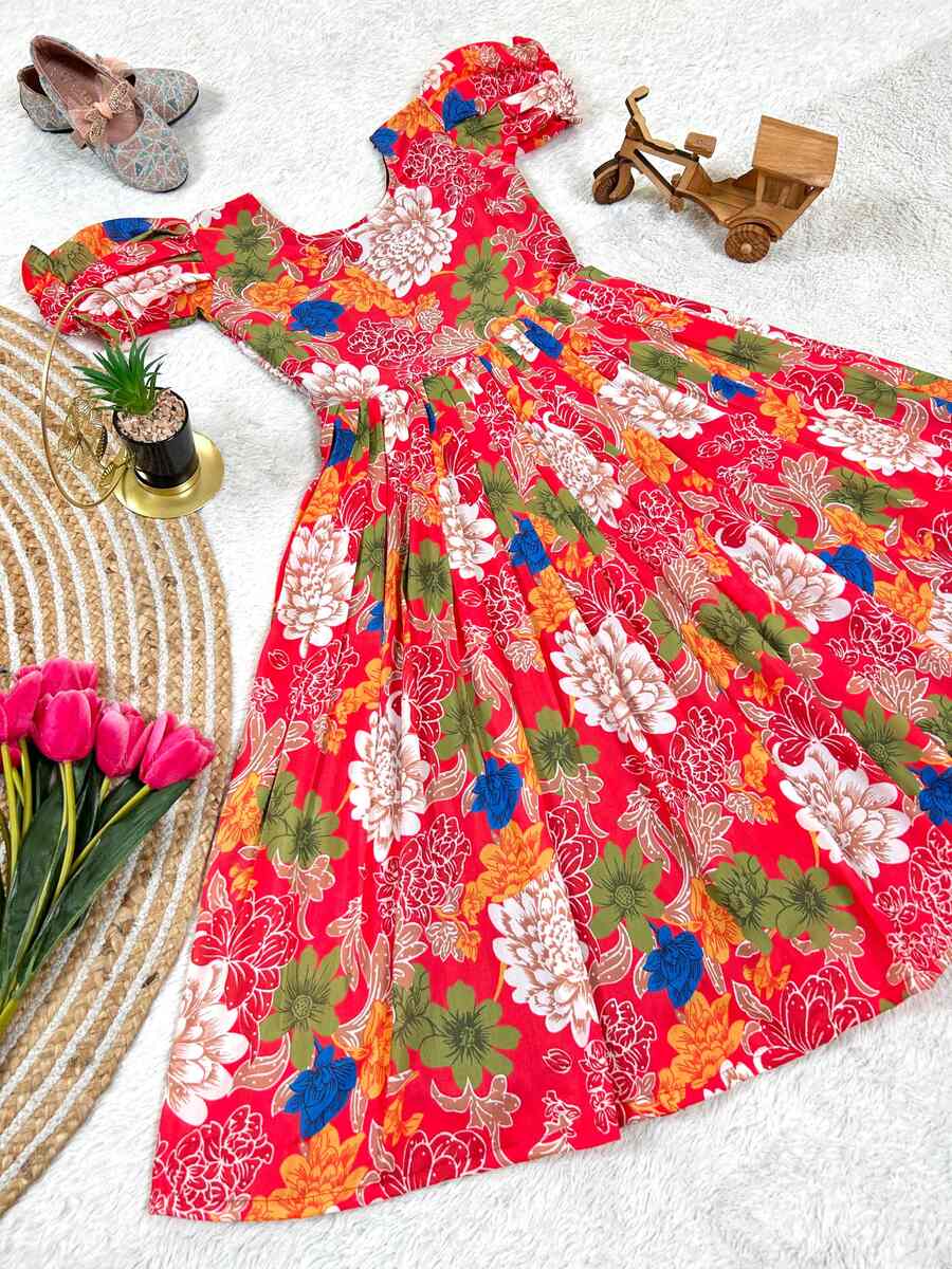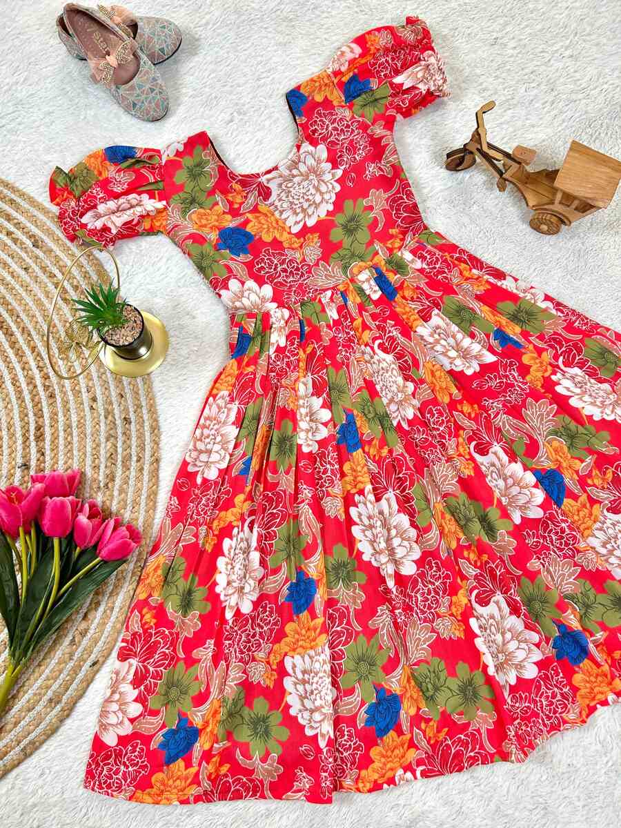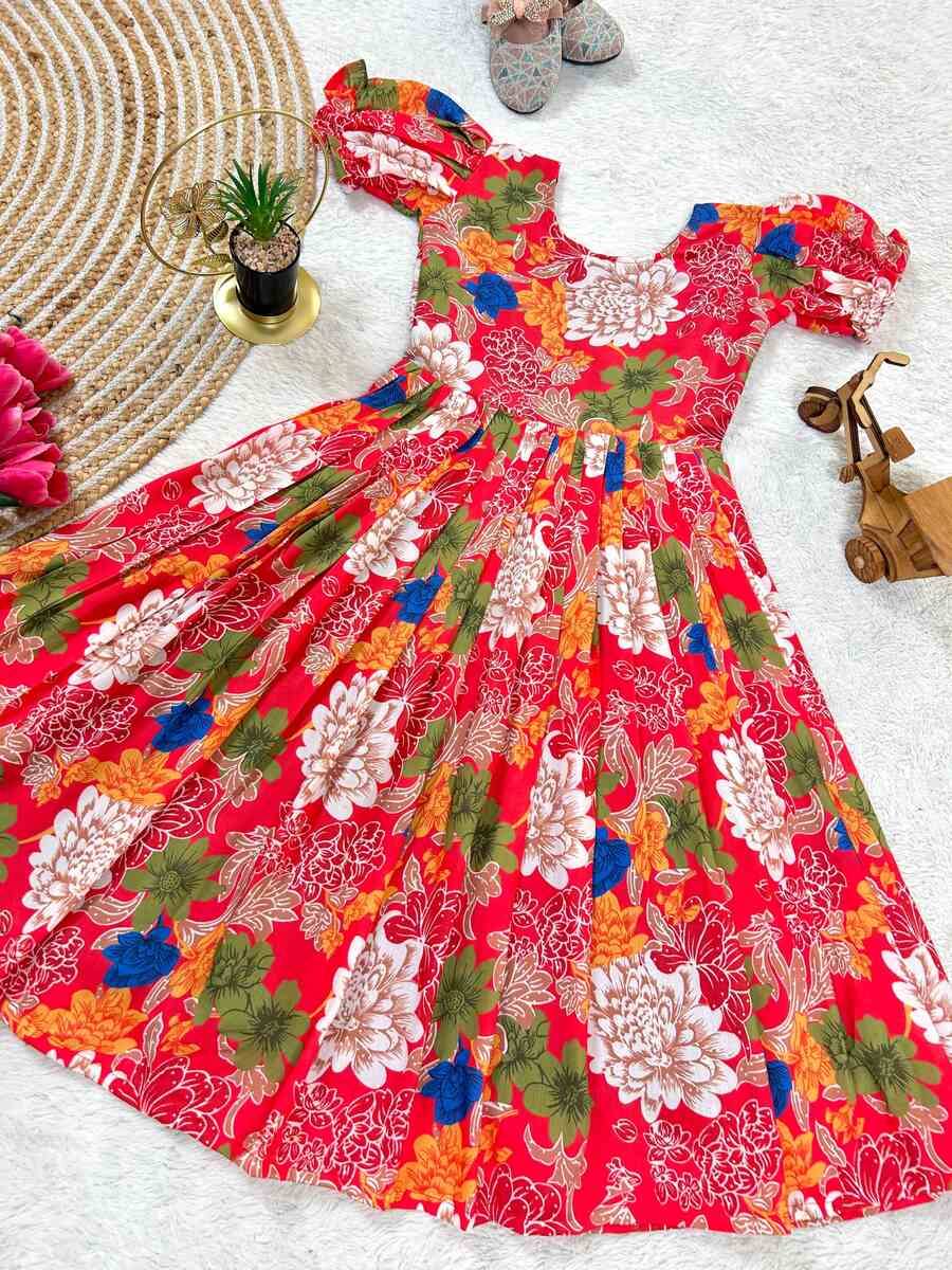 LATEST COTTON DIGITAL FLORAL PRINT KID’S GOWN RED