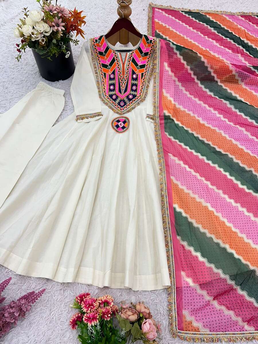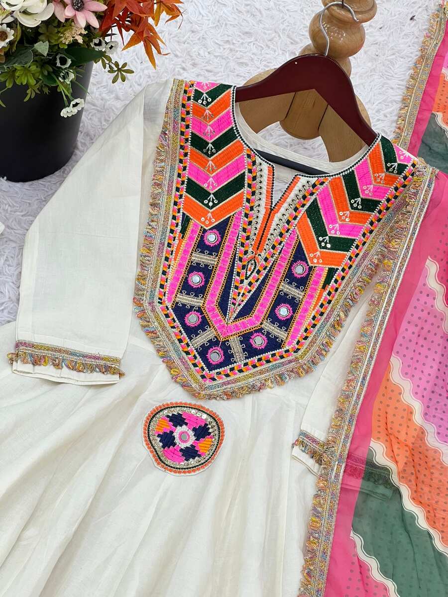 LATEST COTTON EMBROIDERY SEQUENCE WORK WITH REAL MIRROR WORK TOP BOTTOM WITH DUAPTTA WHITE