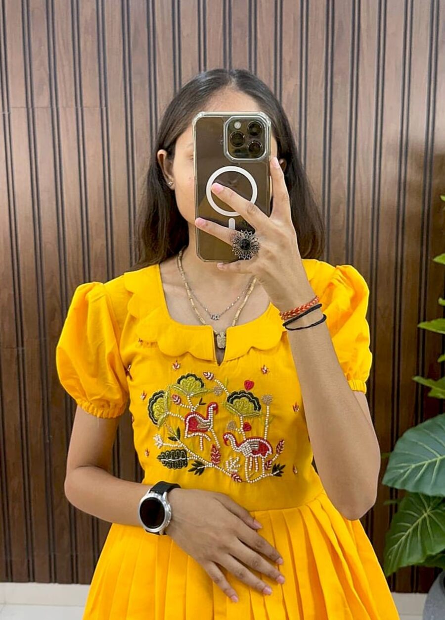 LATEST COTTON SILK HANDWORK ONE PIECE DRESS YELLOW