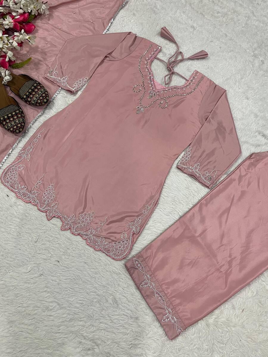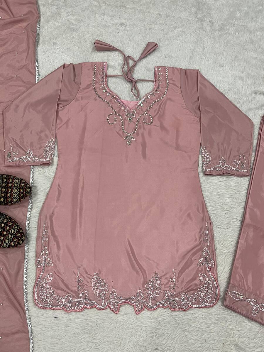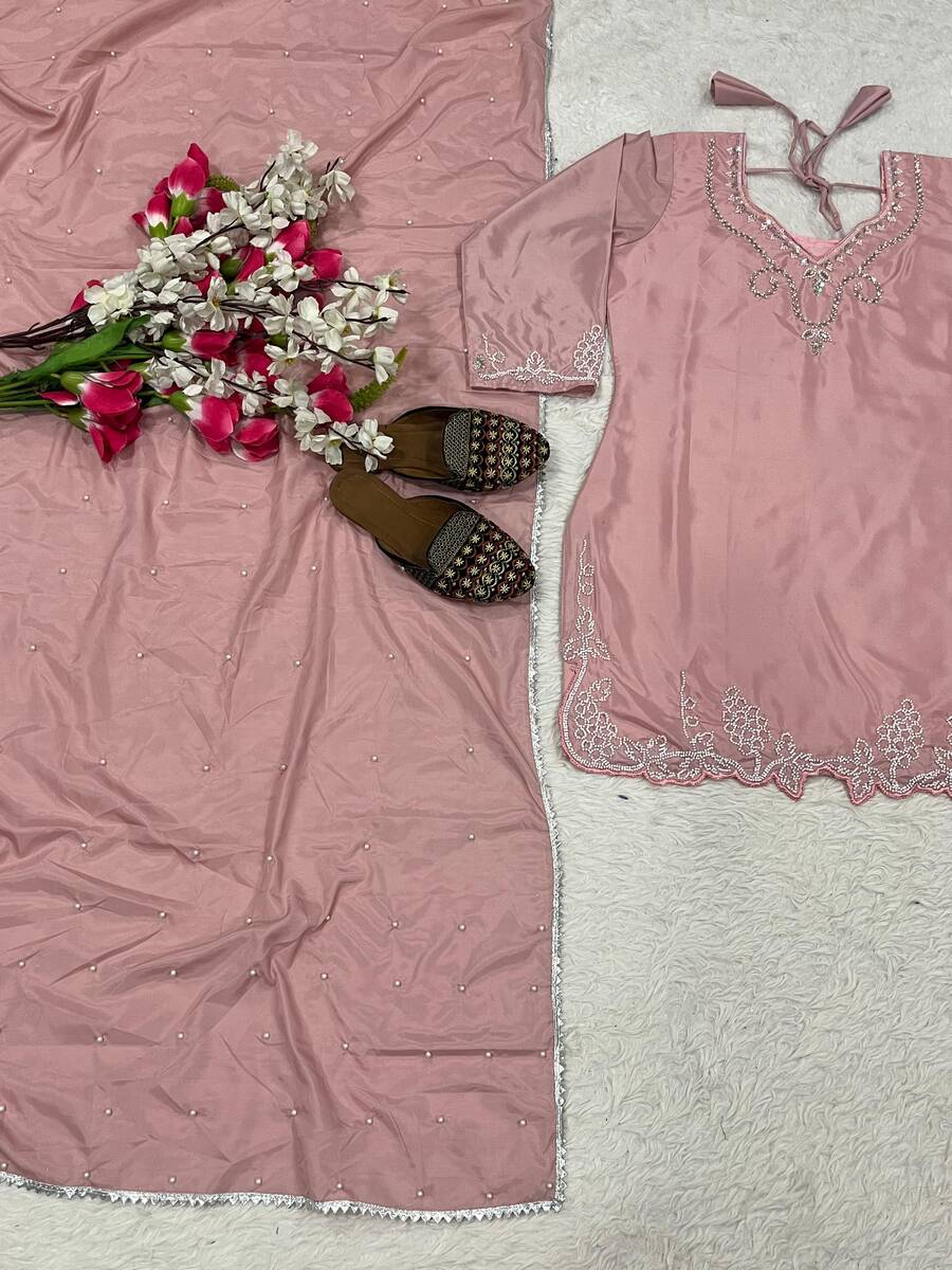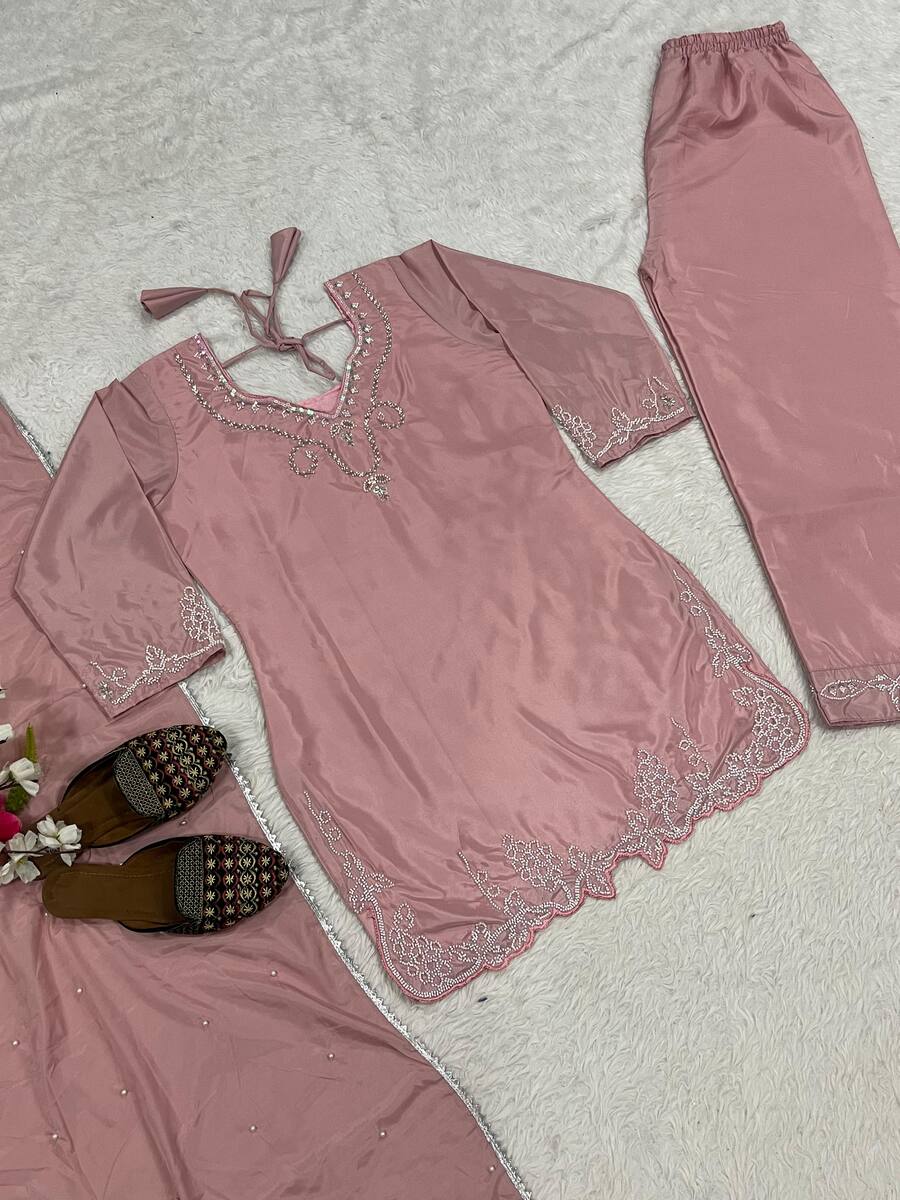 LATEST CREPE SILK HAND WORK TOP PALAZZO WITH DUPATTA BABY PINK