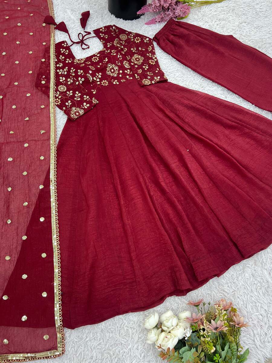 LATEST CRUNCHY SILK LACE BORDER WORK GOWN BOTTOM WITH DUPATTA MAROON