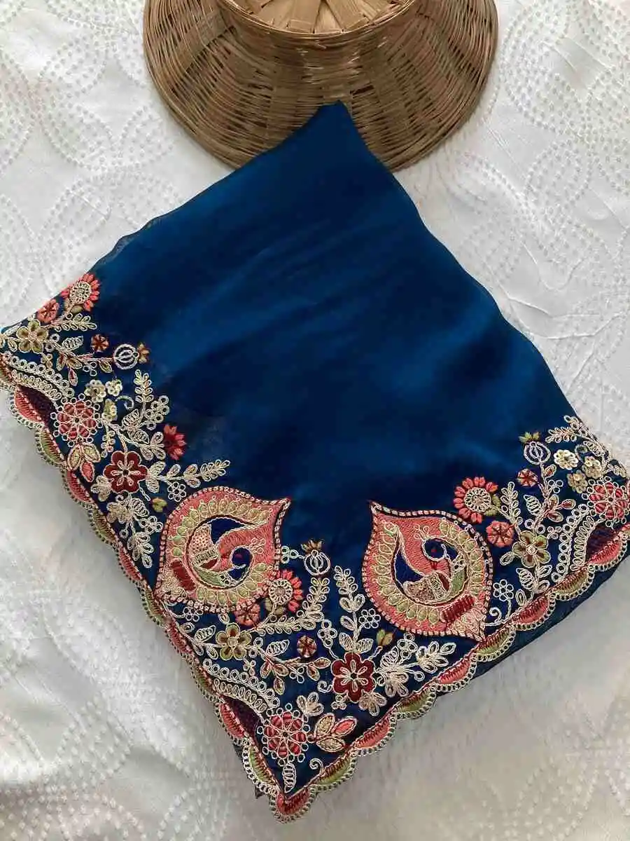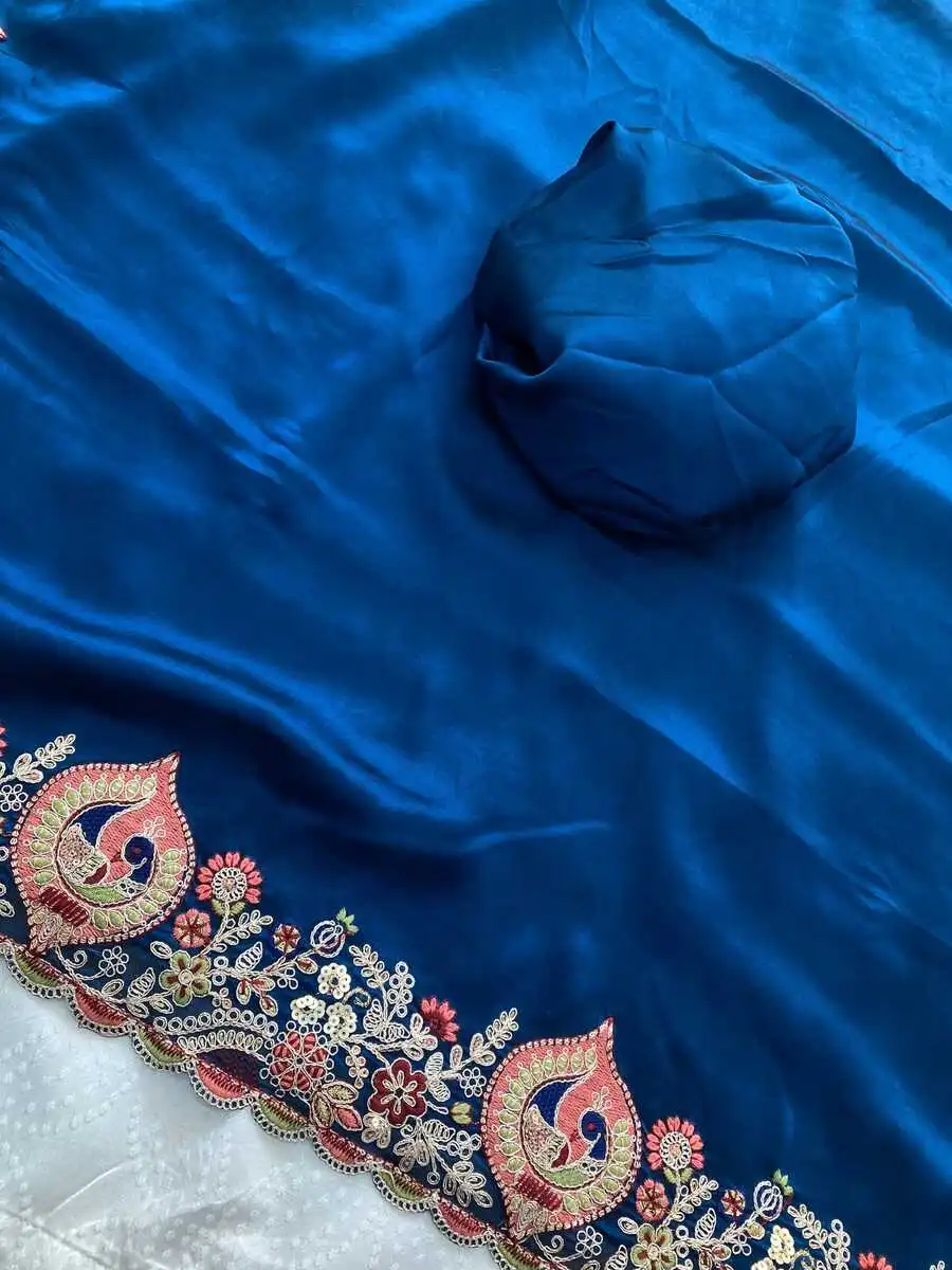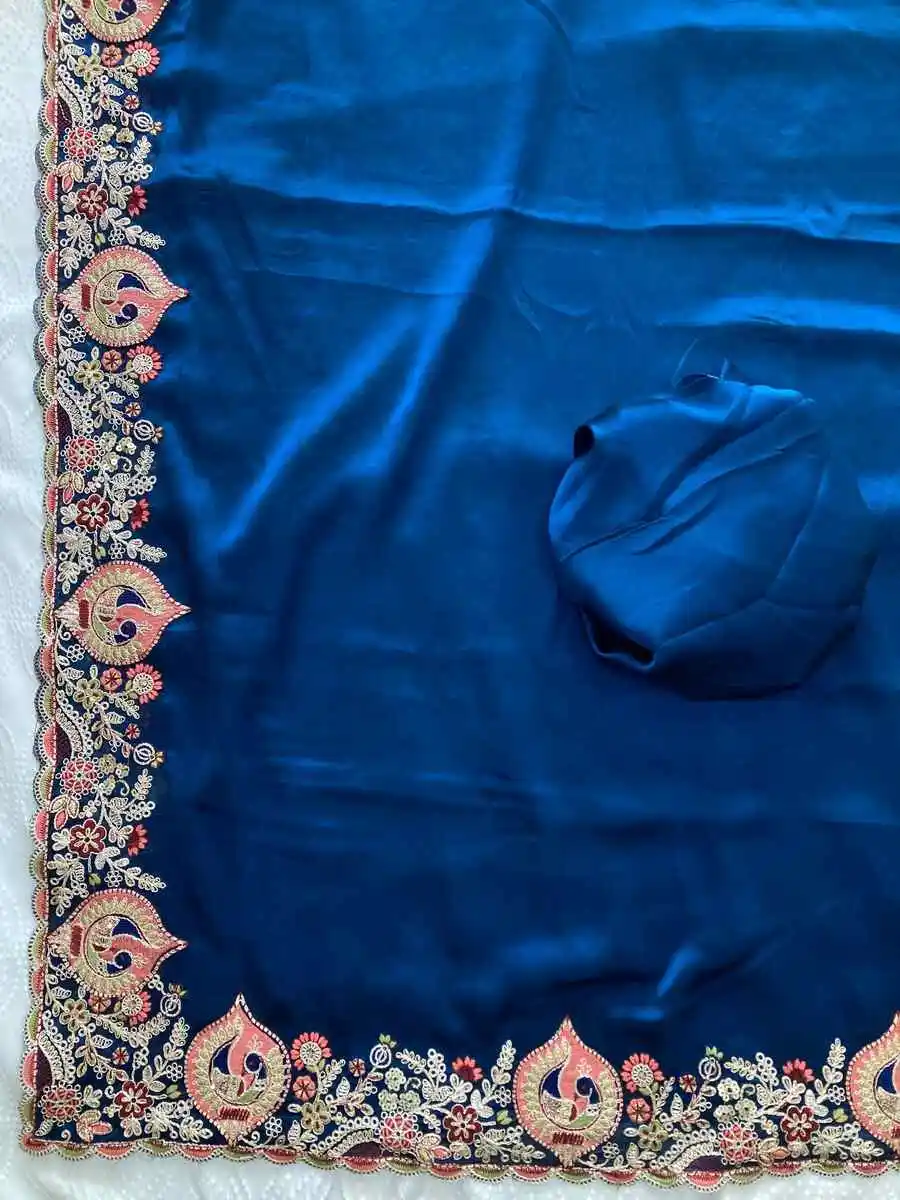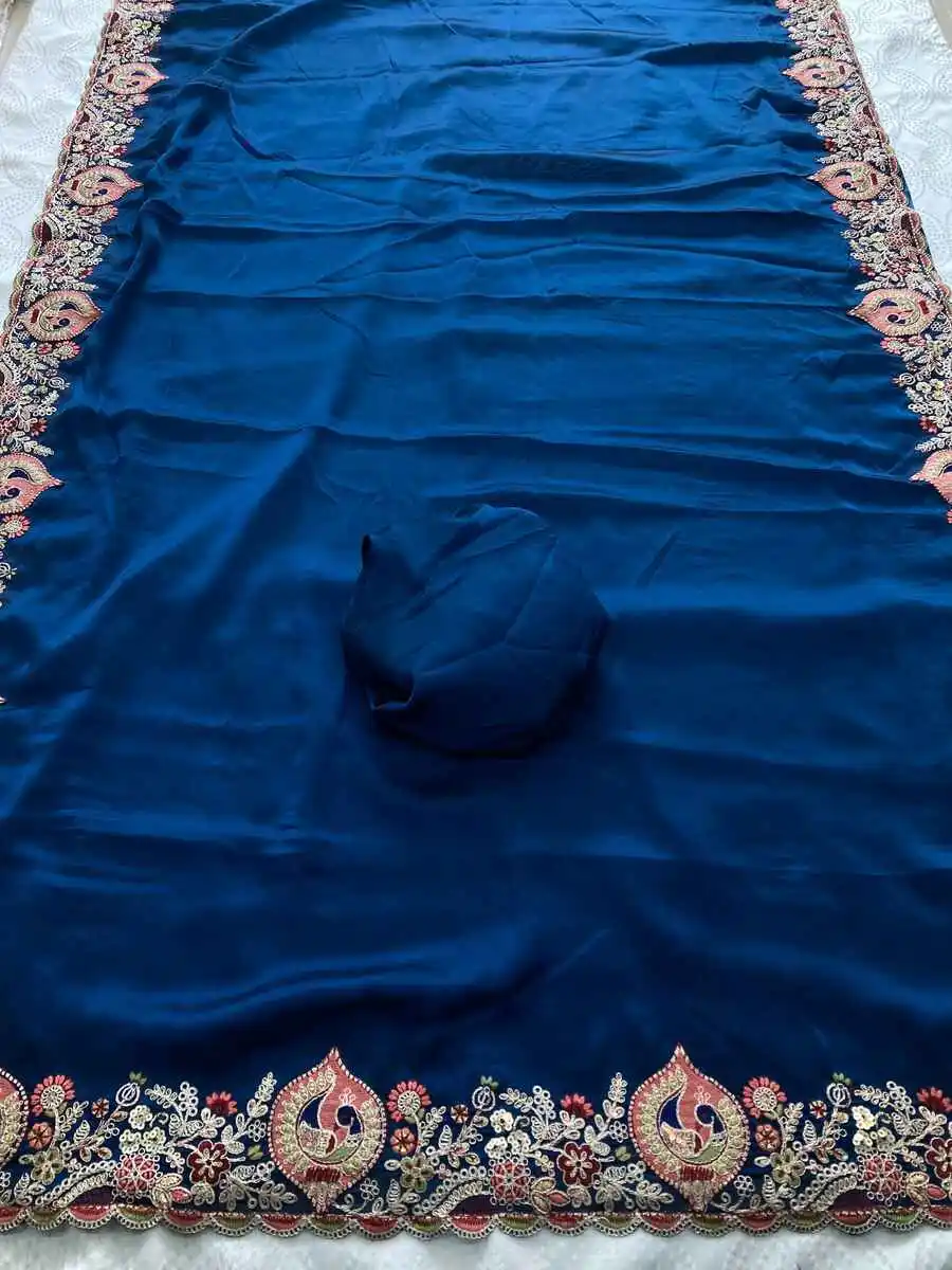 LATEST CRUSH SILK EMBROIDERY WITH CUTWORK BORDER WORK SAREE WITH UNSTITCHED BLOUSE BLUE