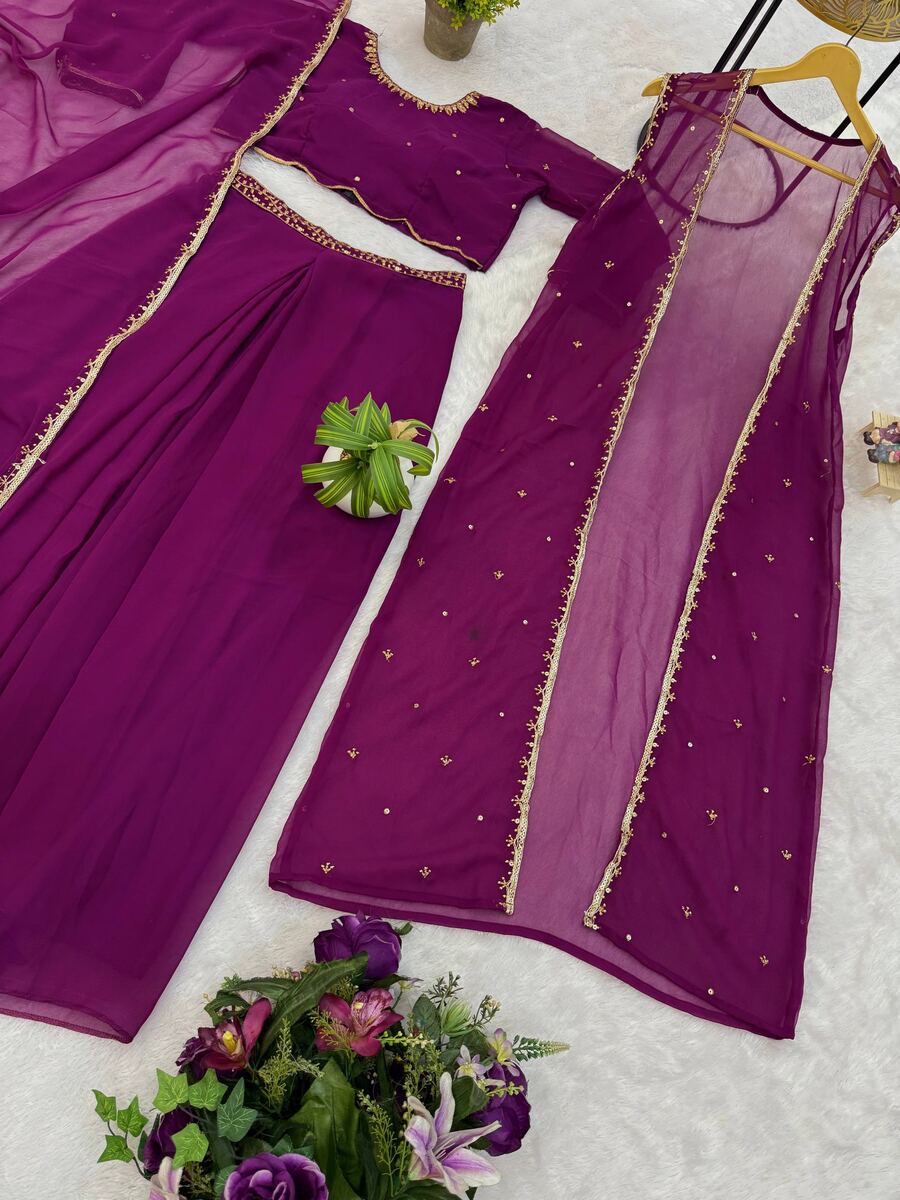 LATEST FAUX GEORGETTE LIGHT EMBROIDERY BORDER WORK LEHENGA BLOUSE SHRUG WITH DUPATTA WINE