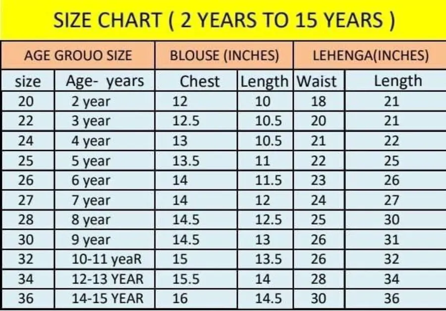 SIZE :- 3 YRS | 4 YRS | 5 YRS | 6 YRS | 7 YRS | 8 YRS | 9 YRS | 10 YRS | 11 YRS | 12 YRS | 13 YRS | 14 YRS | 15 YRS |