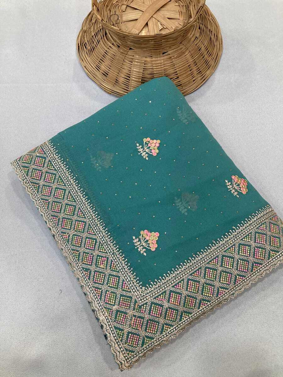 LATEST GEORGETTE EMBROIDERY WITH PIPING BORDER WORK SAREE WITH UNSTITCHED BLOUSE SKY