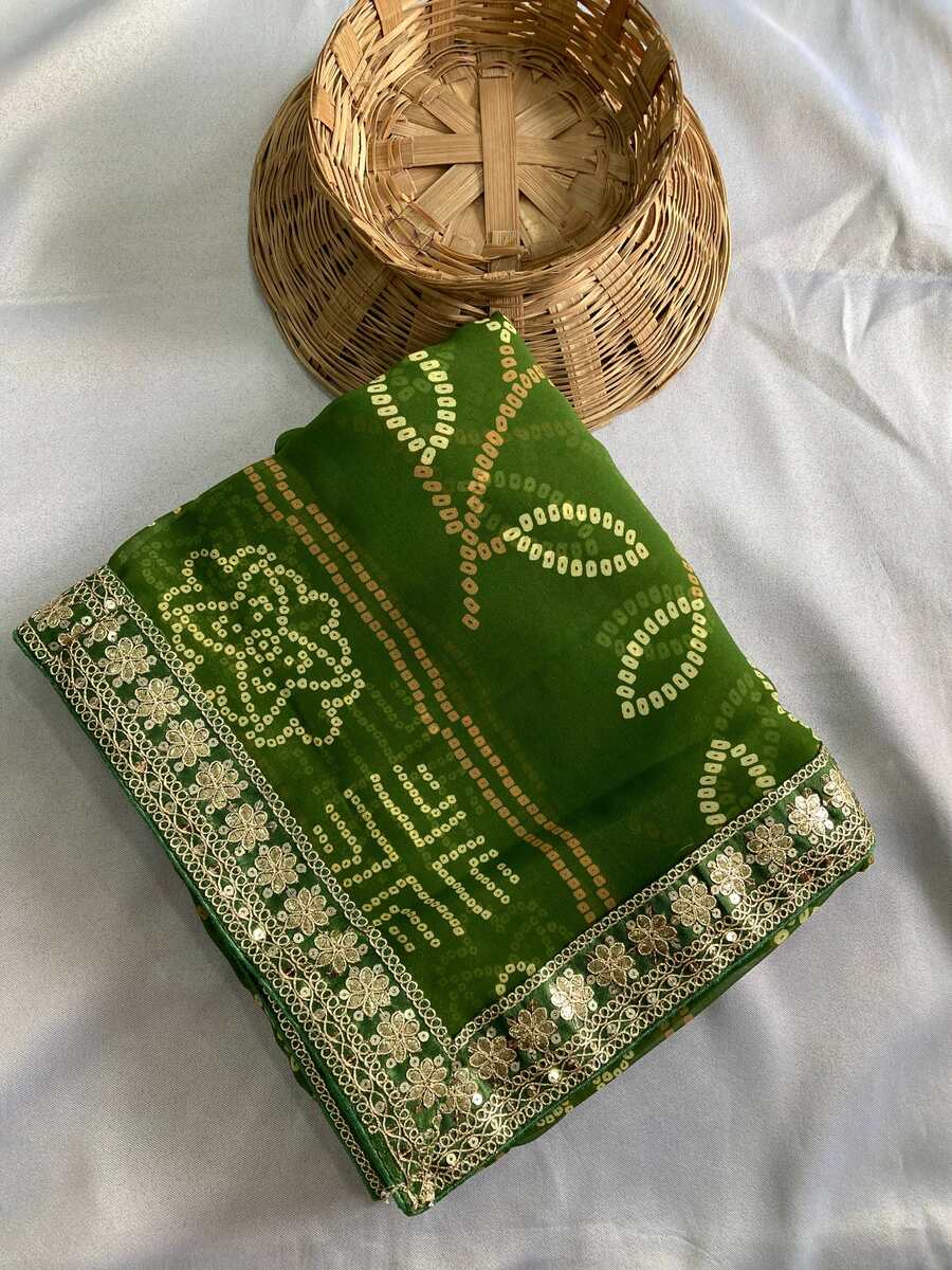 LATEST GEORGETTE RAJWADI BANDHEJ PRINT WITH EMBROIDERY WORK SAREE WITH UNSTITCHED BLOUSE PARROT GREEN