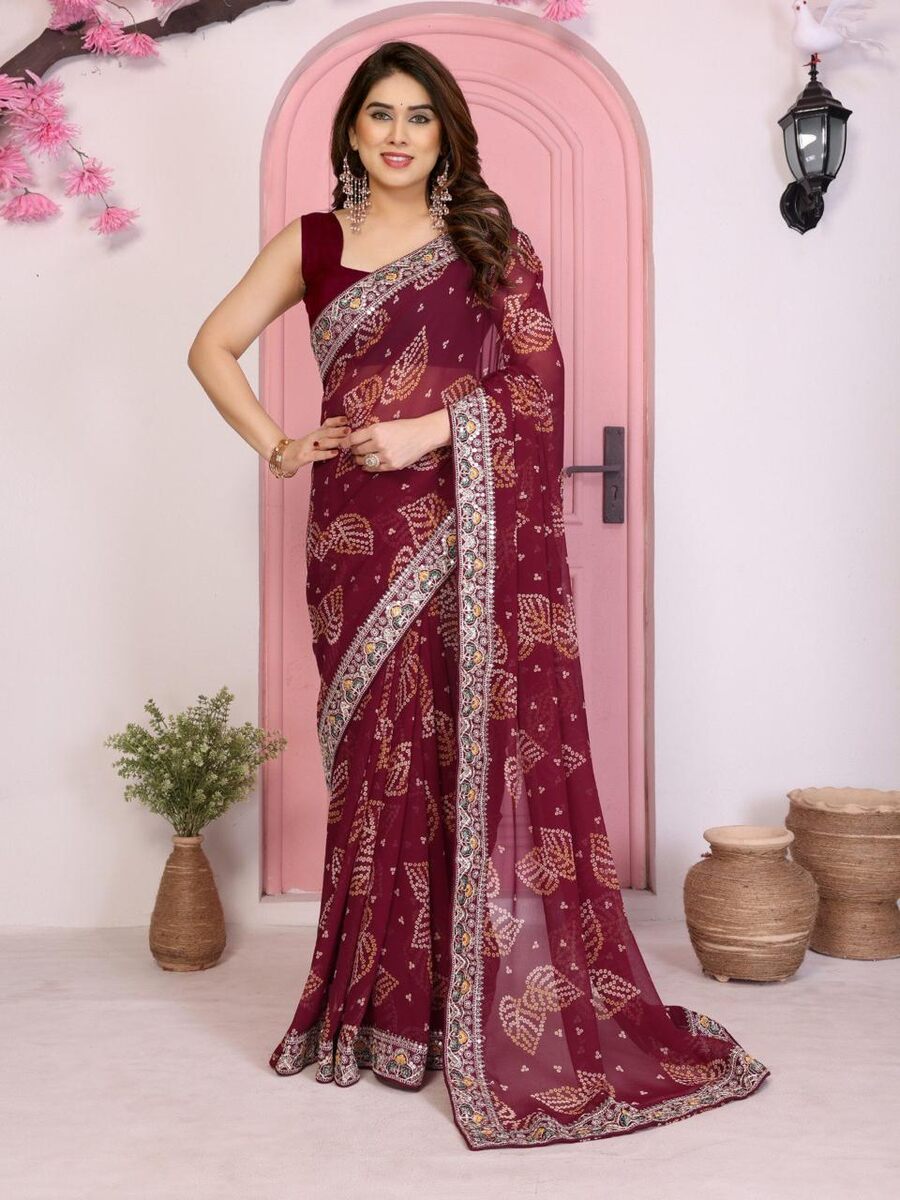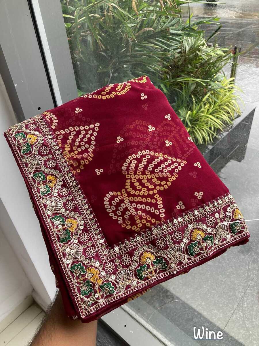LATEST GEORGETTE RAJWADI BANDHEJ PRINT WITH EMBROIDERY WORK SAREE WITH UNSTITCHED BLOUSE WINE