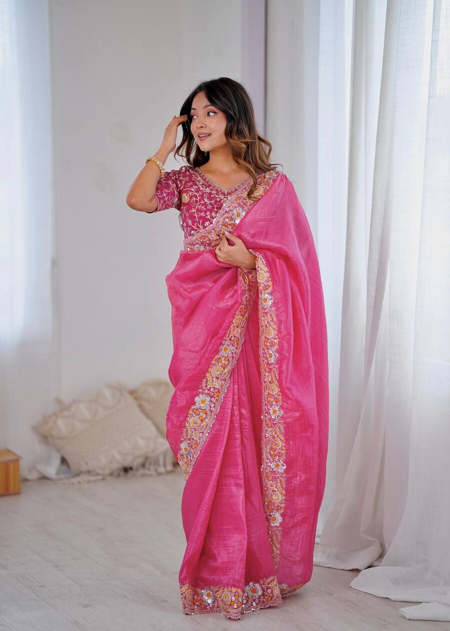 LATEST GOLD CRUSH EMBROIDERY THREADS, CODING & SEQUENCE WORK SAREE WITH UNSTITCHED BLOUSE PINK