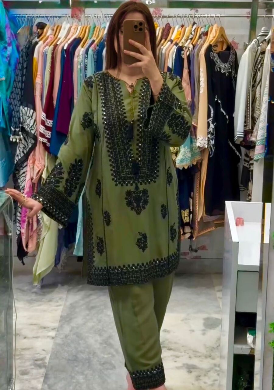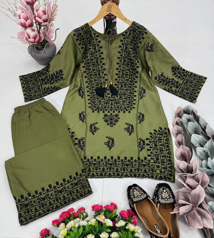 LATEST JAM COTTON EMBROIDERY SEQUENCES WORK KURTI PALAZZO GREEN